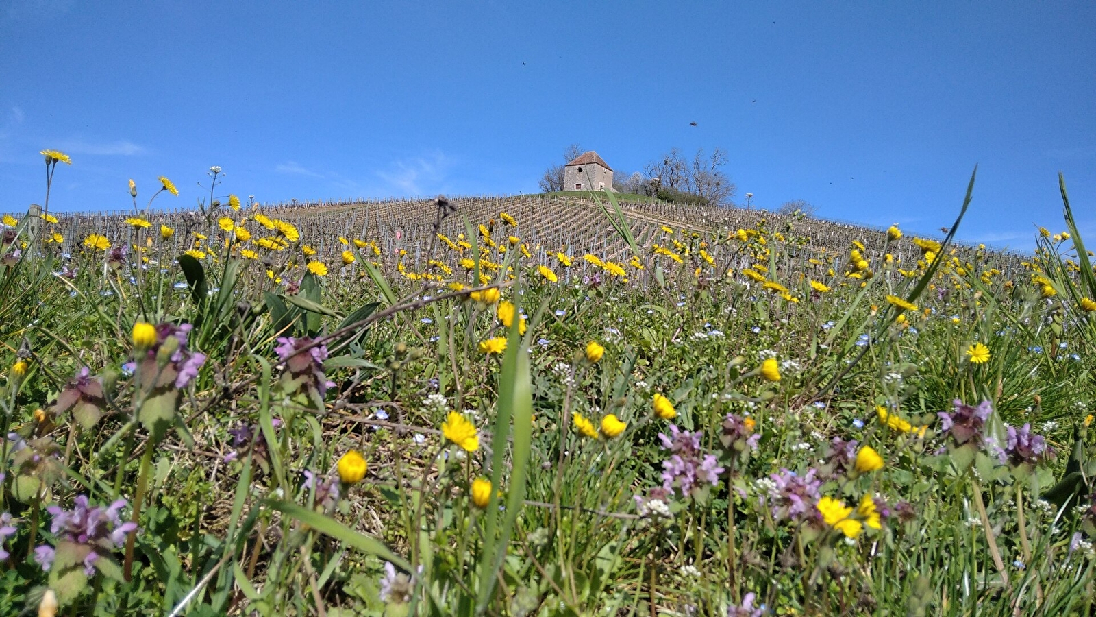 - Obliquer à droite le long des murgers, on domine la vallée. Quitter le chemin pour prendre un sentier à gauche entre les buis et les pierres moussues : admirer le vaste panorama sur la vallée de la Grosne (à ce niveau une variante de 4km est possible. Elle est indiquée par un poteau).