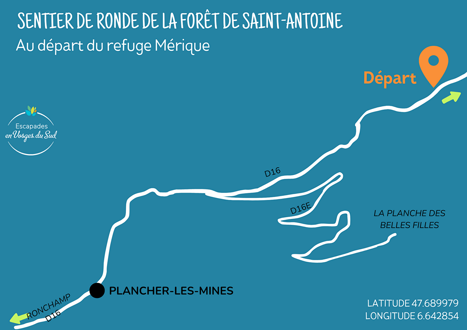 Le départ de ce sentier se fait en sortant de la commune de Plancher-les-Mines, on continue tout droit sur la D16. Vous pourrez stationner près du refuge Mérique, vous continuez en montant la route, sur la droite, face au pont du Plain Janvier.