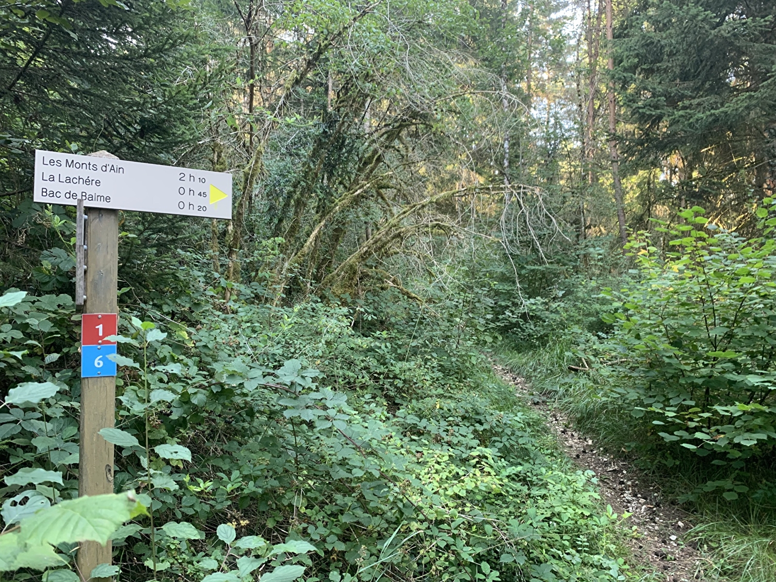 A la route goudronnée, prendre à droite, impasse de la Lachère. A la Lachère, monter à gauche et continuer de progresser vers l'est jusqu'à un premier point de vue. S'élever vers les Monts d'Ain et longeant la Roche du Bois Don.