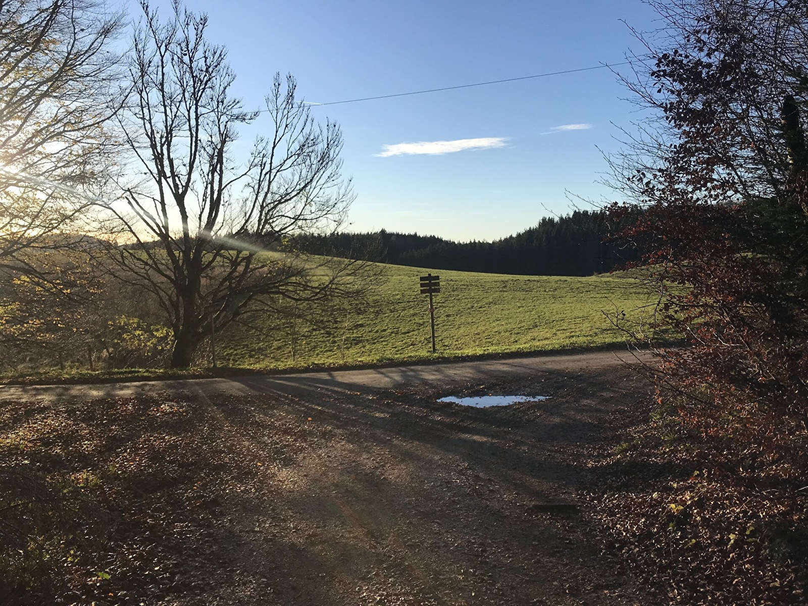 Suivre à gauche le chemin d'abord empierré puis goudronnée .Ignorer le chemin à gauche. Au carrefour, continuer tout droit, longer la ferme Fontaine puis traverser le parking pour monter à gauche et gagner l'aire de décollage des parapentes.