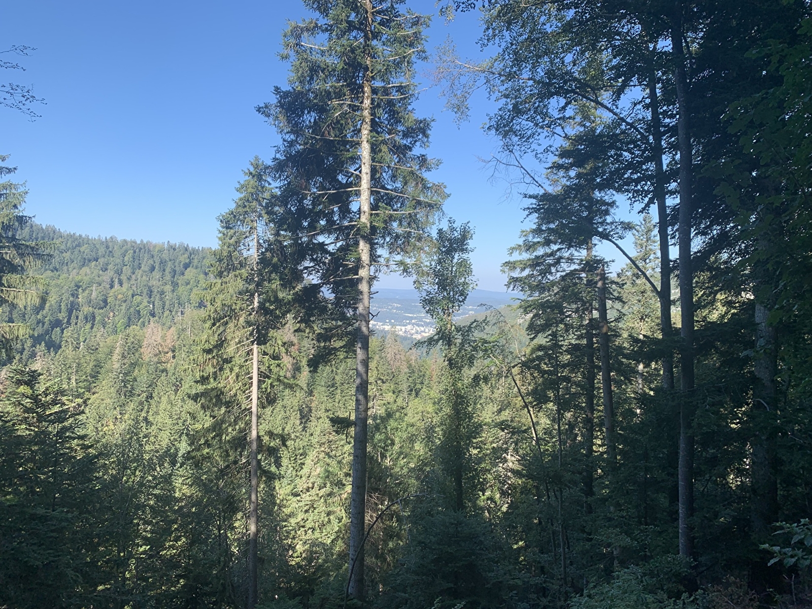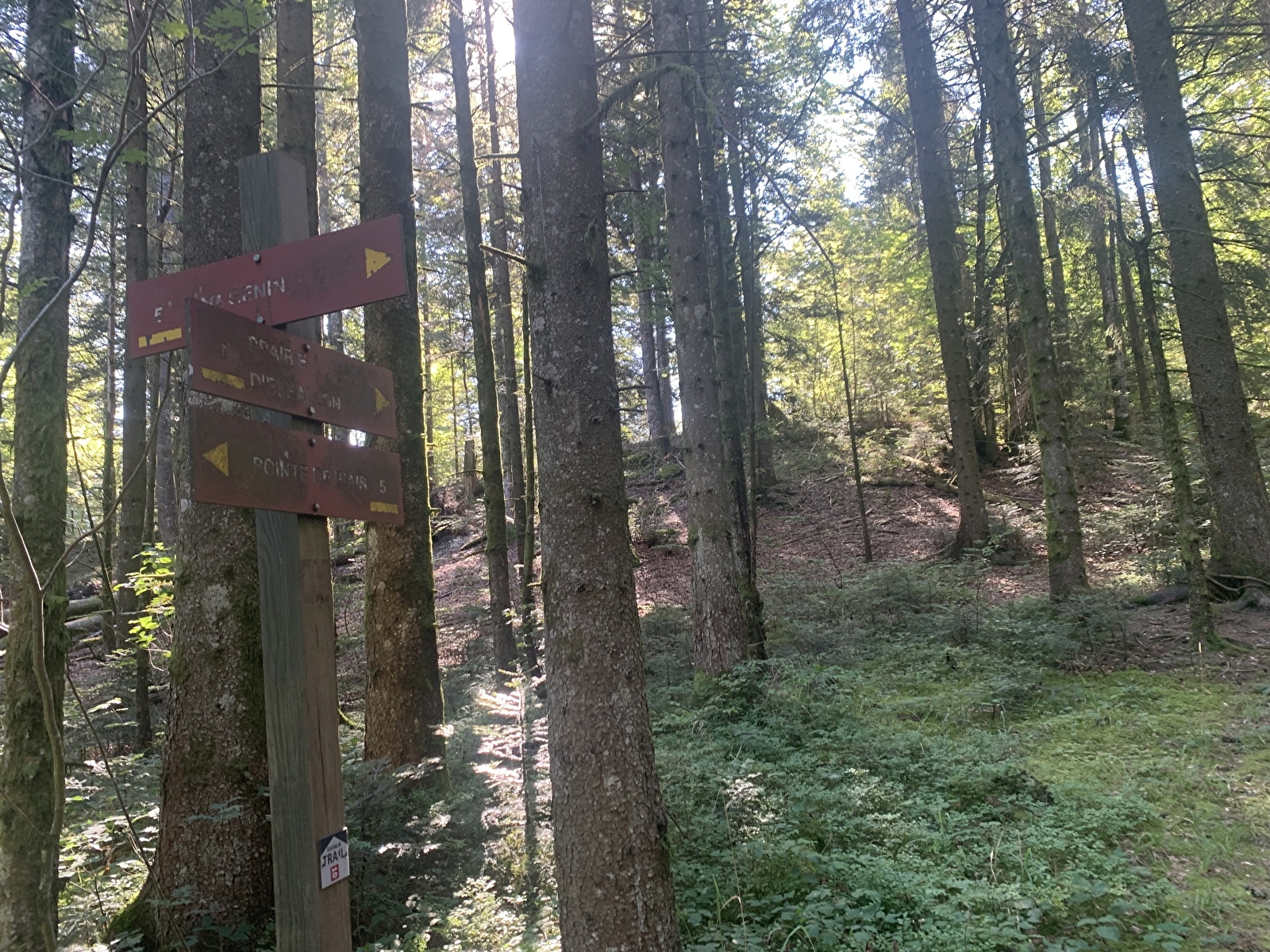 Remonter la route sur 50m sur la droite. Traverser et bifurquer sur le premier chemin à gauche qui s'élève vers le nord. Au prochain carrefour, poursuivre en face. Monter puis descendre un large sentier en longeant les Roches du Péret. Au carrefour suivant, monter à droite sur une pente assez raide vers le Haut Péret (1050m). Descendre avec prudence jusqu'à l'embranchement suivant.