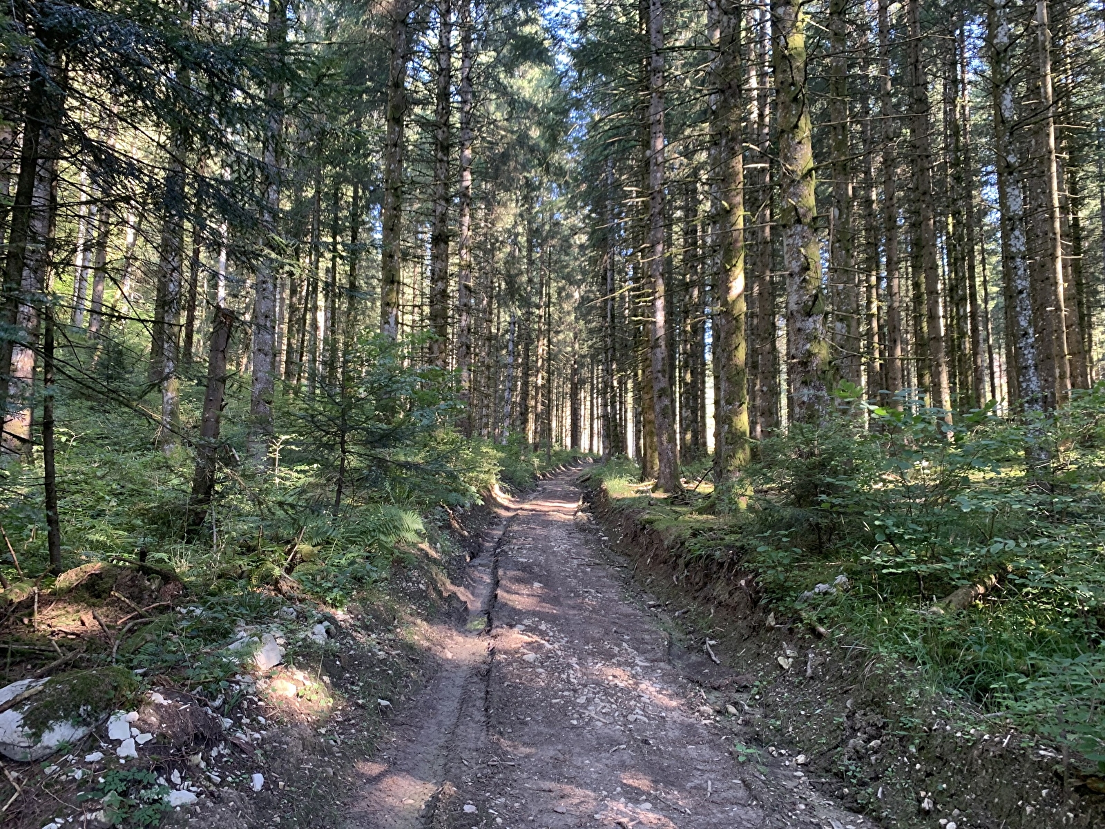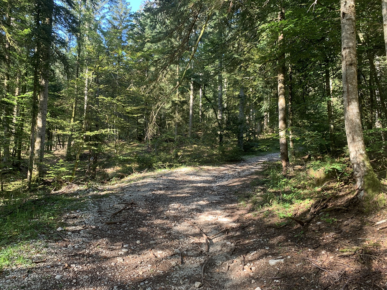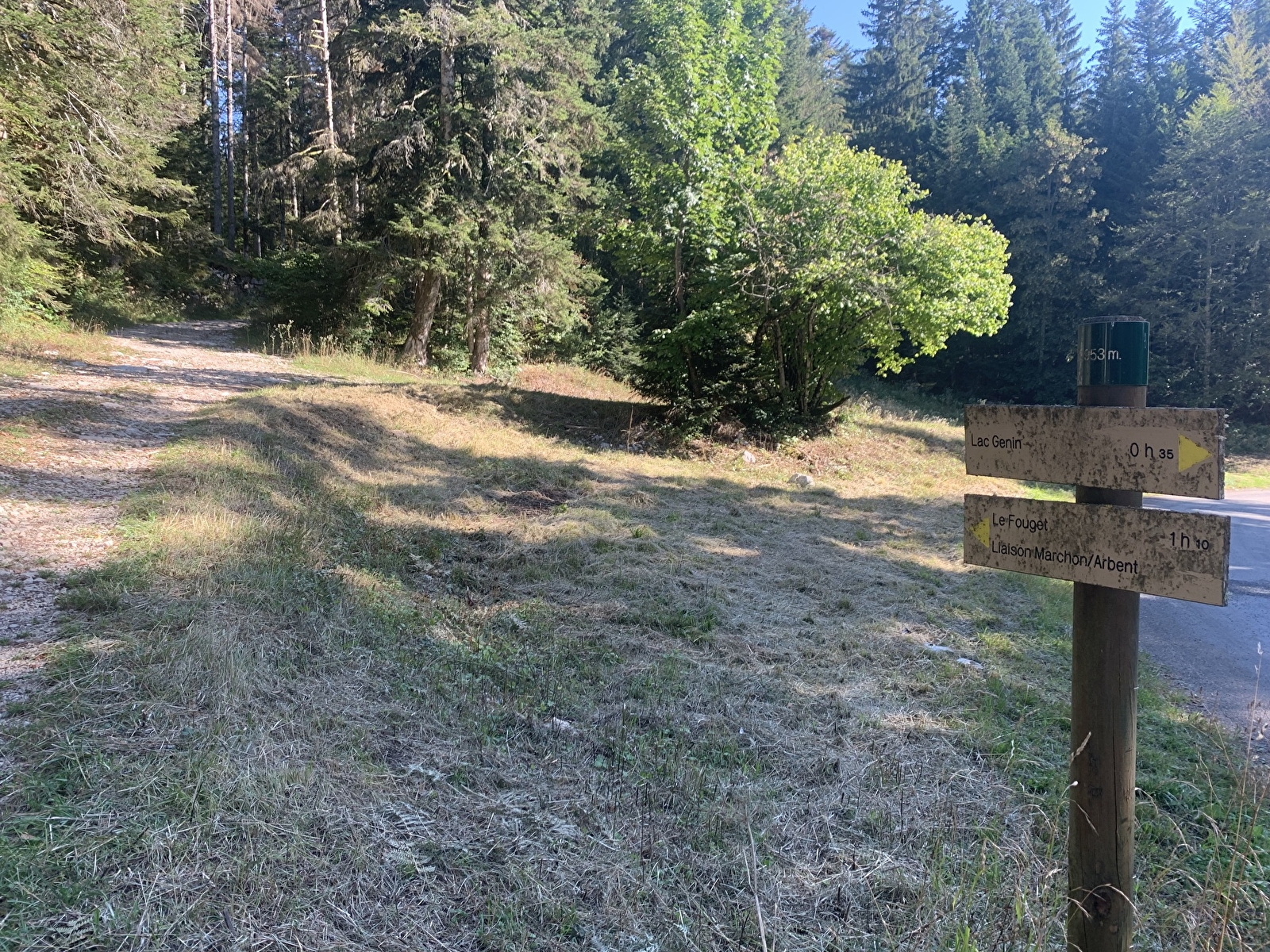 Au monument (915m), dans la prairie d'Echallon, ne pas prendre la route, mais le chemin à droite. Monter légèrement au sud-ouest jusqu'au Golet des Prés, puis descendre et longer le haras des Ecuries de Jade. Poursuivre sur un chemin carrossable jusqu'à un carrefour.