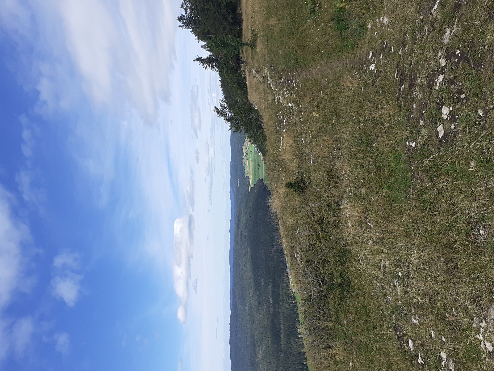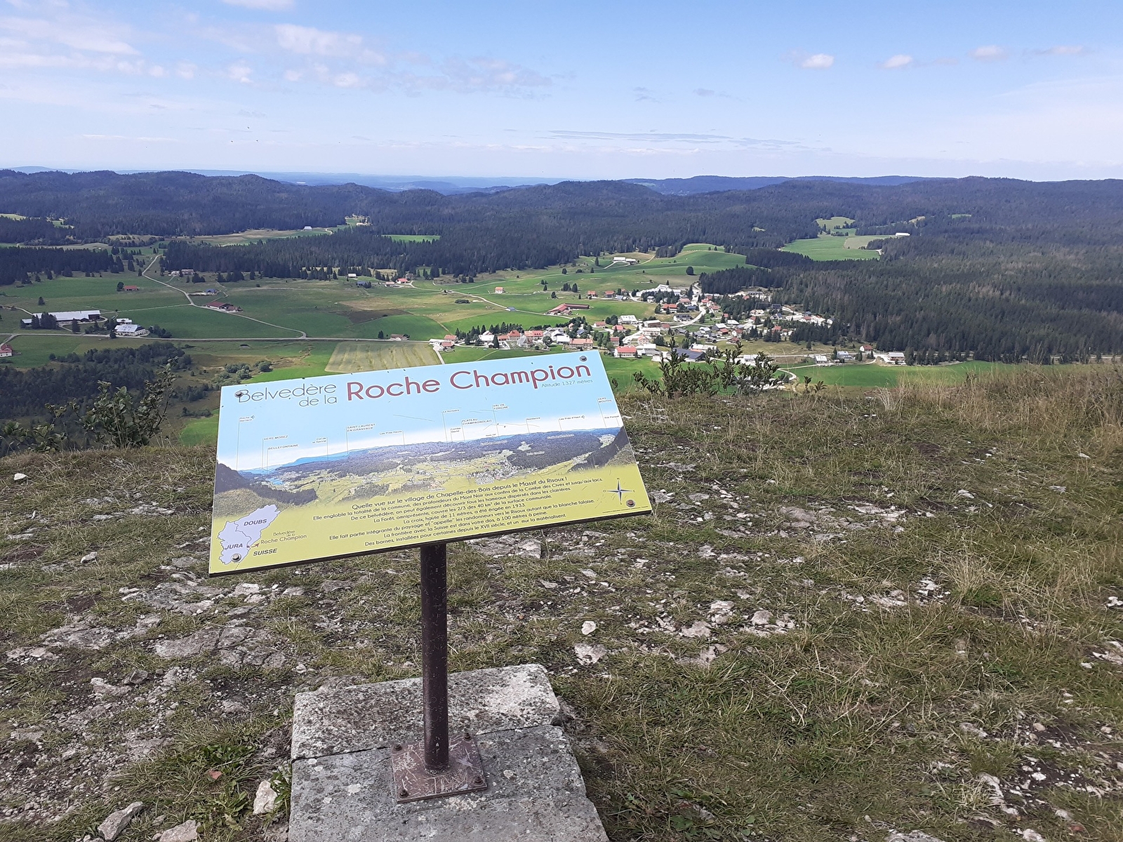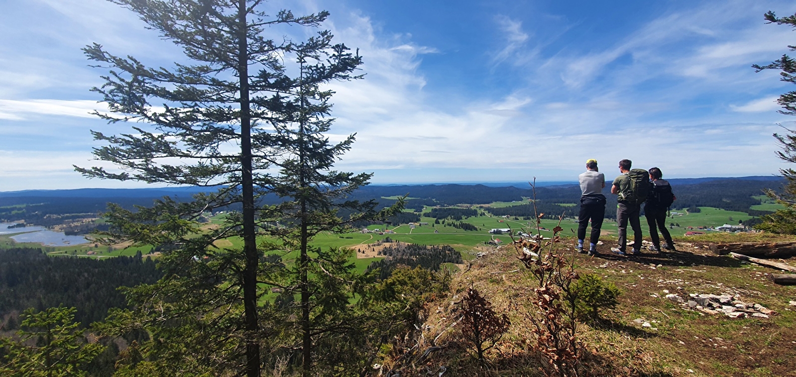Du haut de la barre rocheuse qui surplombe le val de Chapelle des Bois et son village, le regard embrasse un large paysage, de la combe des Cives au nord aux deux lacs presque jumeaux que sont le lac des Mortes et le lac de Bellefontaine au sud.