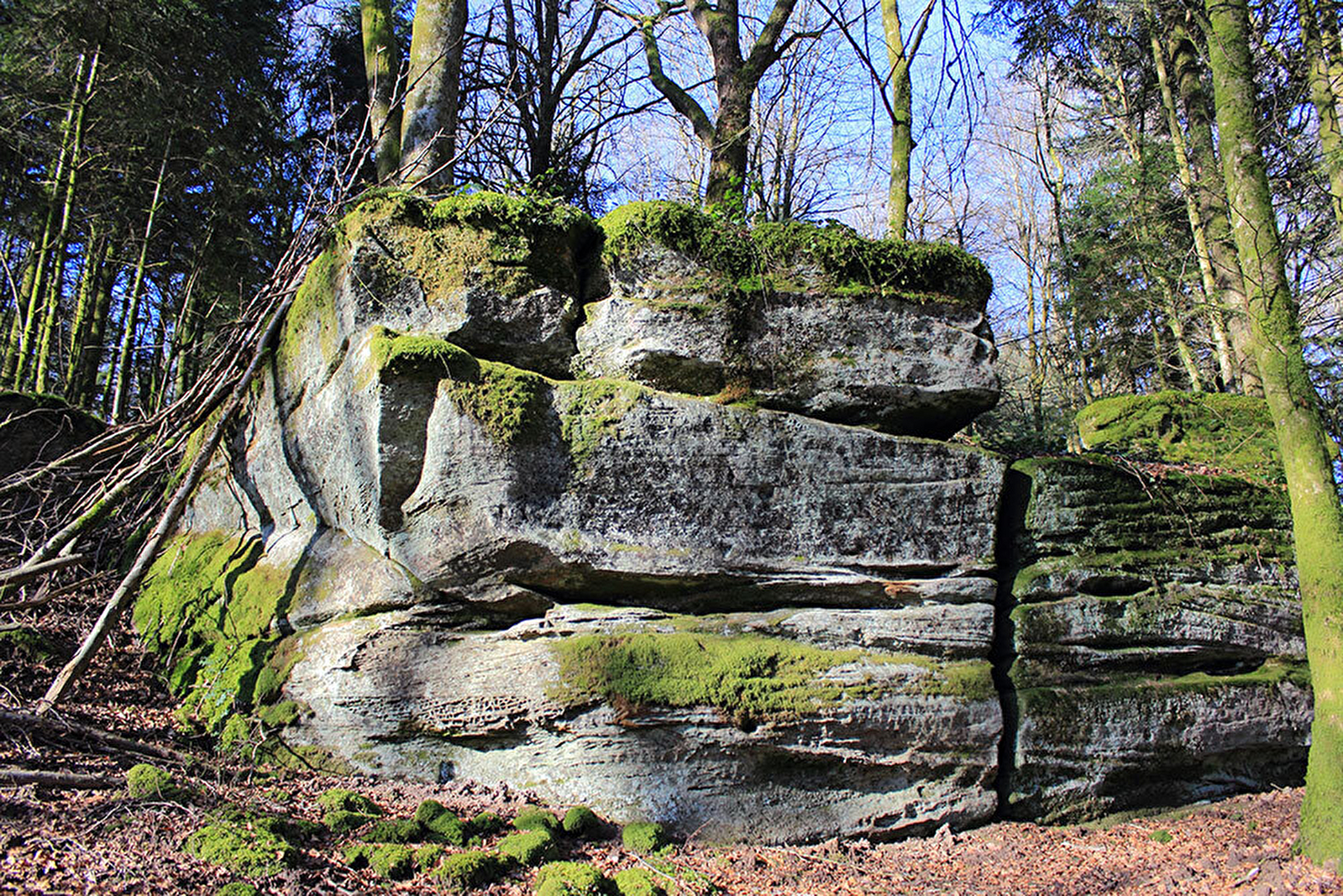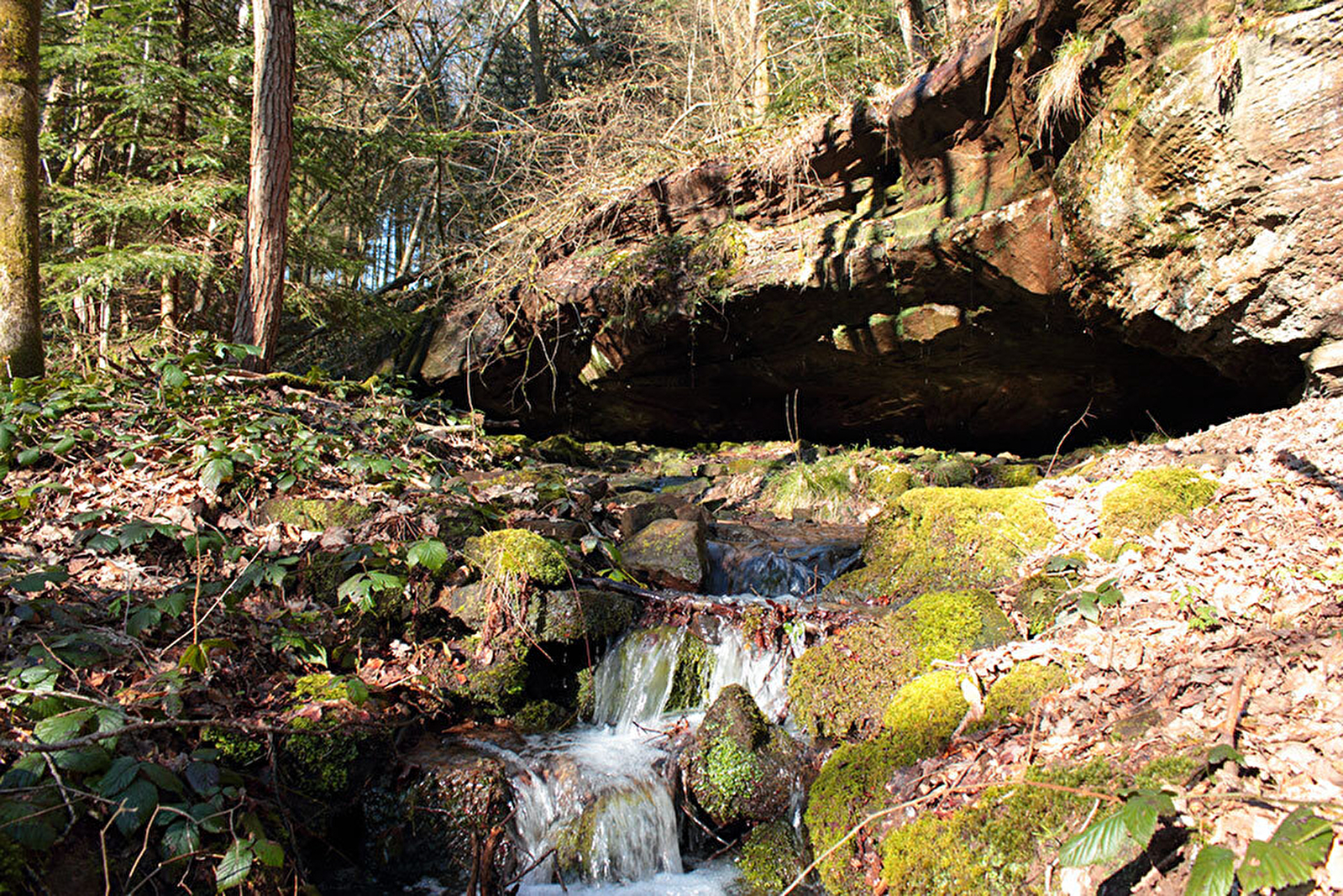 Dans le bois de Lancerand, des plates-formes de grès aux allures étonnantes surplombent le sentier des Pierres-de-Roûges. Magnifique en toute saison… au printemps avec les toutes jeunes feuilles sur les arbres, en été parce que la futaie et l’eau permettent de rester au frais, en automne à cause des couleurs flamboyantes des arbres, et de jolies stalactites de glace en hiver. Parfait sentier familial.