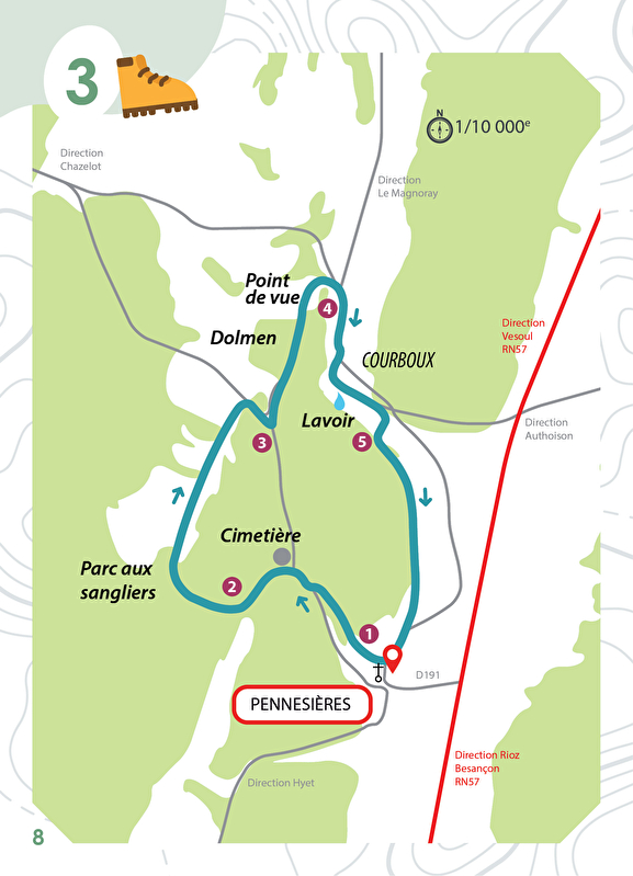 2• Prendre à droite et longer le parc aux sangliers. Arriver sur le chemin goudronné, tourner à droite.