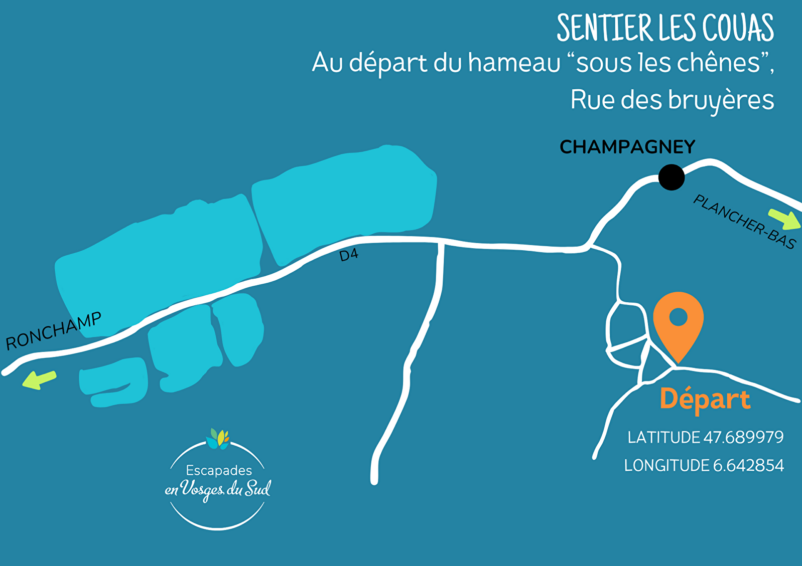 Cette randonnée se situe dans le secteur Sud de la commune de Champagney, au hameau de « Sous les Chênes ». Cet agréable circuit vous permettra d'admirer la flore et la richesse hydraulique du secteur. Vous ne tarderez pas à remarquer les terres rouges qui proviennent de l’argile et des grès dégradés de l’âge permien.