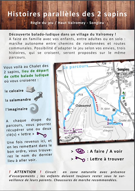 Ce sentier ludique, accessible dès 7/8 ans, a été élaboré pour les Journées Européennes du Patrimoine en 2017 par des bénévoles, le CPIE Bugey-Genevois et les associations du Cercle Amical de Songieu et d'Ain'terlude en Bugey.