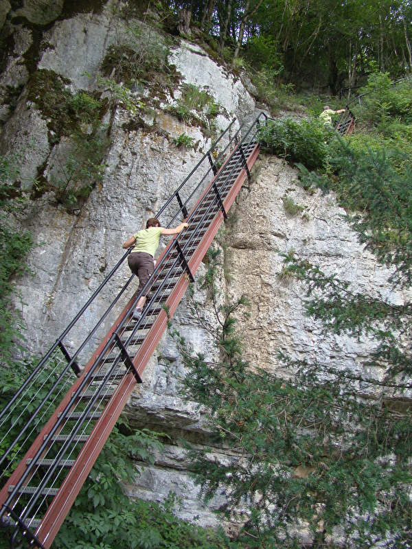 En direction de la Suisse, parcourez les sentiers forestiers, les sentes au-dessus des falaises et les couleuses jadis empruntés par les contrebandiers intrépides et les villageois en quête de produits moins onéreux.Arrivé au fond des gorges encaissées, la rivière qui forme la frontière franco-suisse, vous accompagnera de son chant particulier, autrefois complété par le bruit des scieries, des meuniers et l'appel du complice Suisse. Attention ! Les douaniers veillent. Le seul passage libre pour remonter sur le plateau est celui des Échelles de la Mort et du Bois de la Biche !