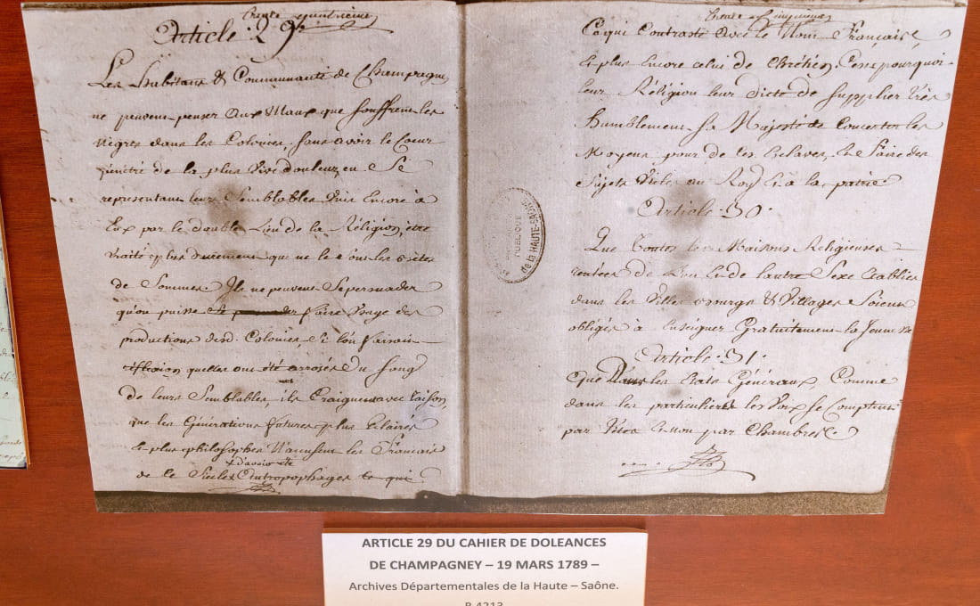 A Champagney, les habitants se sont insurgés contre le sort des esclaves noirs dans un cahier de doléances adressé au Roi Louis XVI en 1789. Le musée leur rend hommage et y présente l'histoire de l'esclavage des noirs à travers textes, maquettes, objets de mémoire.
