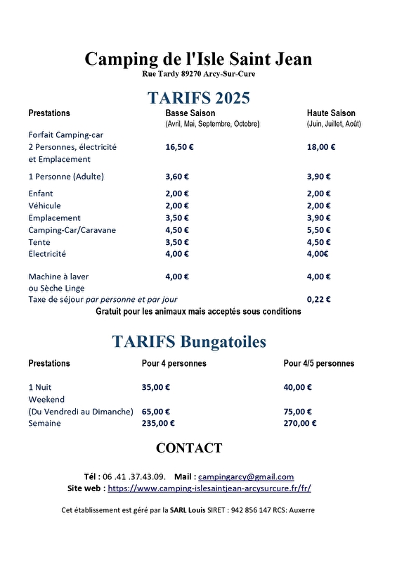 Tarifs :- Location de bungatoiles : Compris entre 35€ et 40€ (Avec vaisselle, réchaud à gaz, frigo, bouilloire, micro onde, nécessaire pour entretien, drap housse, alèses, taies et oreillers à disposition.)