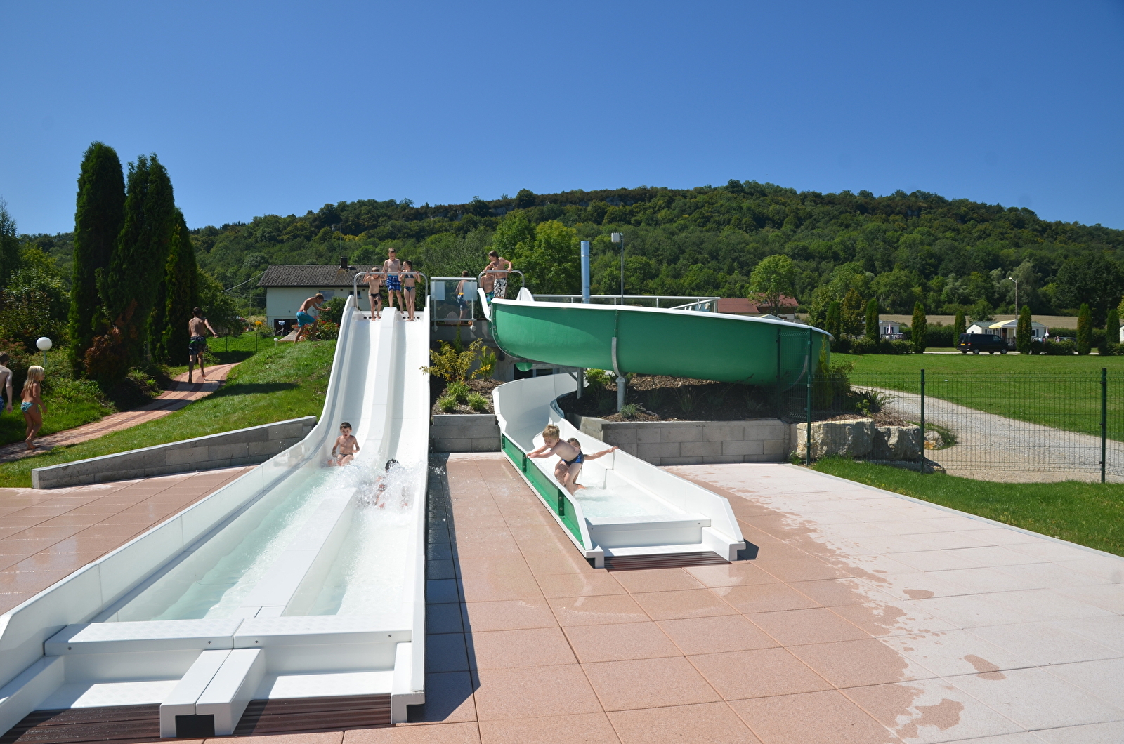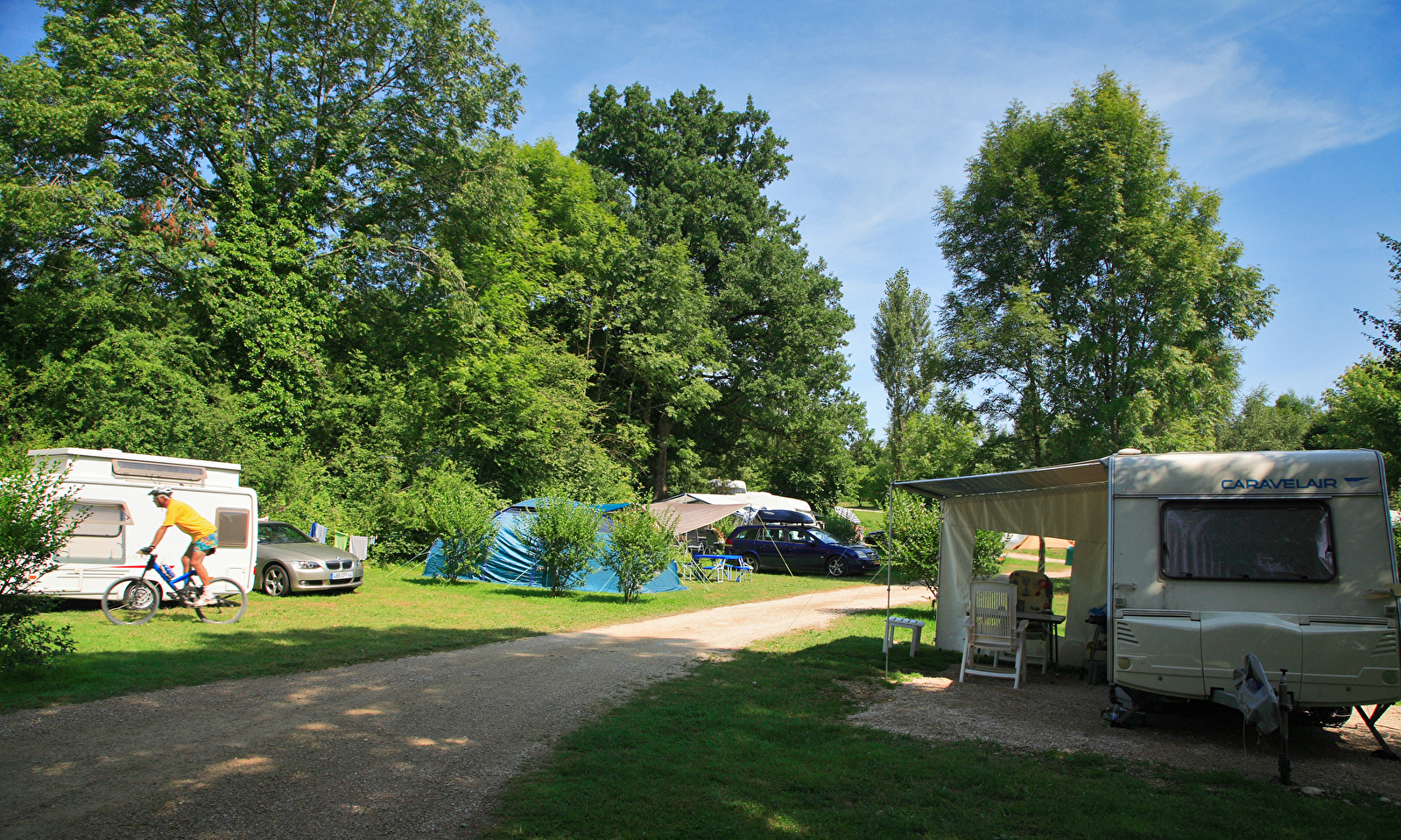 Situé en bordure de l'Ain, cadre verdoyant aménagé en terrasses et proche du lac de Chalain. 2 piscines chauffées avec toboggans, épicerie, dépôt de pain toute la saison et snack uniquement en juillet/aout. .