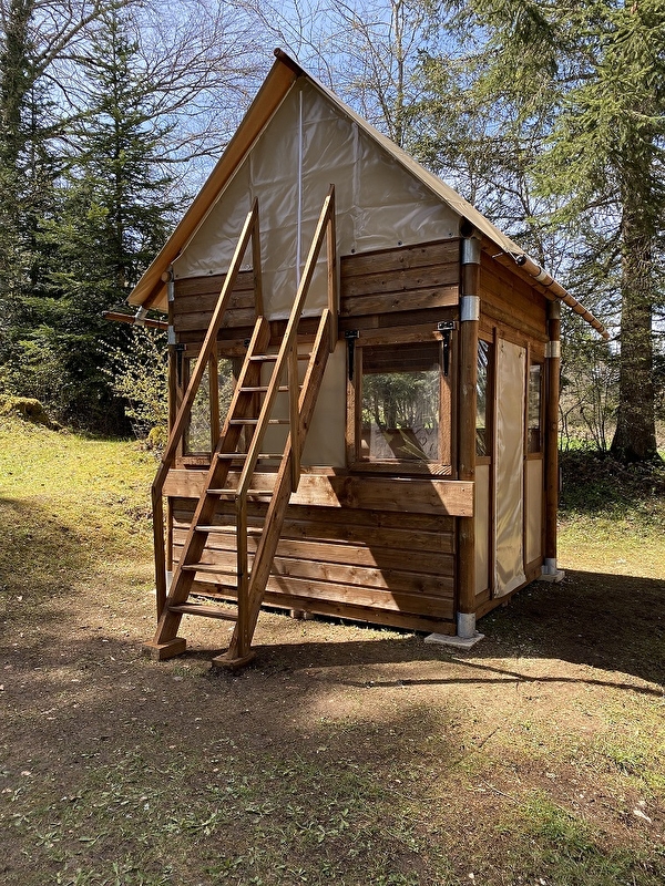 Nous possédons aussi 2 emplacements équipés de cabatentes bivouac : toile et bois composée en partie basse d'un espace pour manger et préparer vos repas (sans matériel), branchement électrique, éclairage. Vous trouverez en partie haute accessible par un escalier 2 couchages équipés de matelas. Location possible à la nuitée ou pour des séjours plus long.