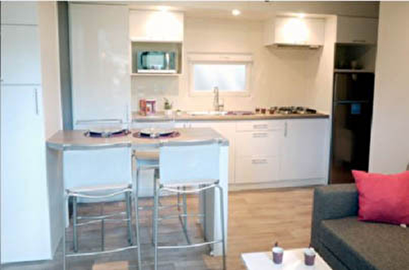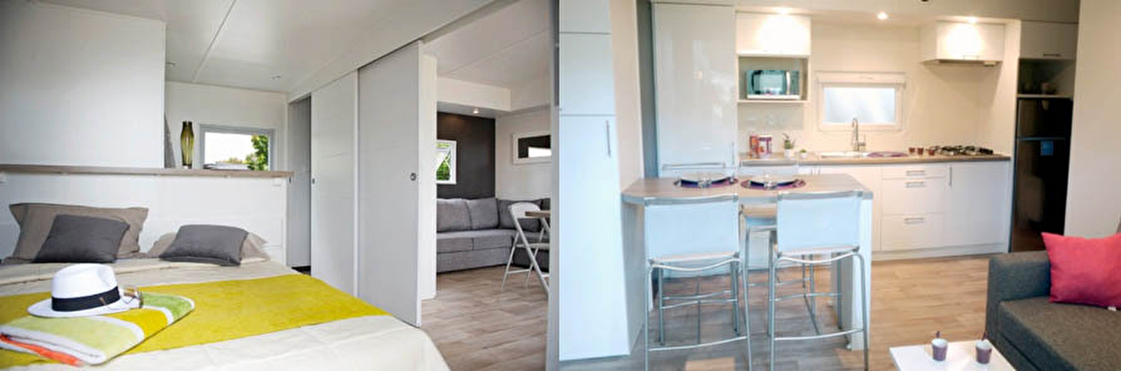 • Mobil home luxe : les TAOS sont une nouvelle gamme de mobil home plus spacieux avec un design moderne et prêt pour vous accueillir ! Cuisine fonctionnelle avec plaque de cuisson à gaz, hotte inox, frigo congélateur, micro-onde et lave-vaisselle, 1 chambre parents avec lit, WC et salle d'eau indépendante et 1 chambre enfants avec 2 lits et aussi WC et salles d'eau indépendantes, salle à manger et séjour avec lit convertible. Une grande terrasse couverte et salon de jardin pour profiter des plus beaux jours !
