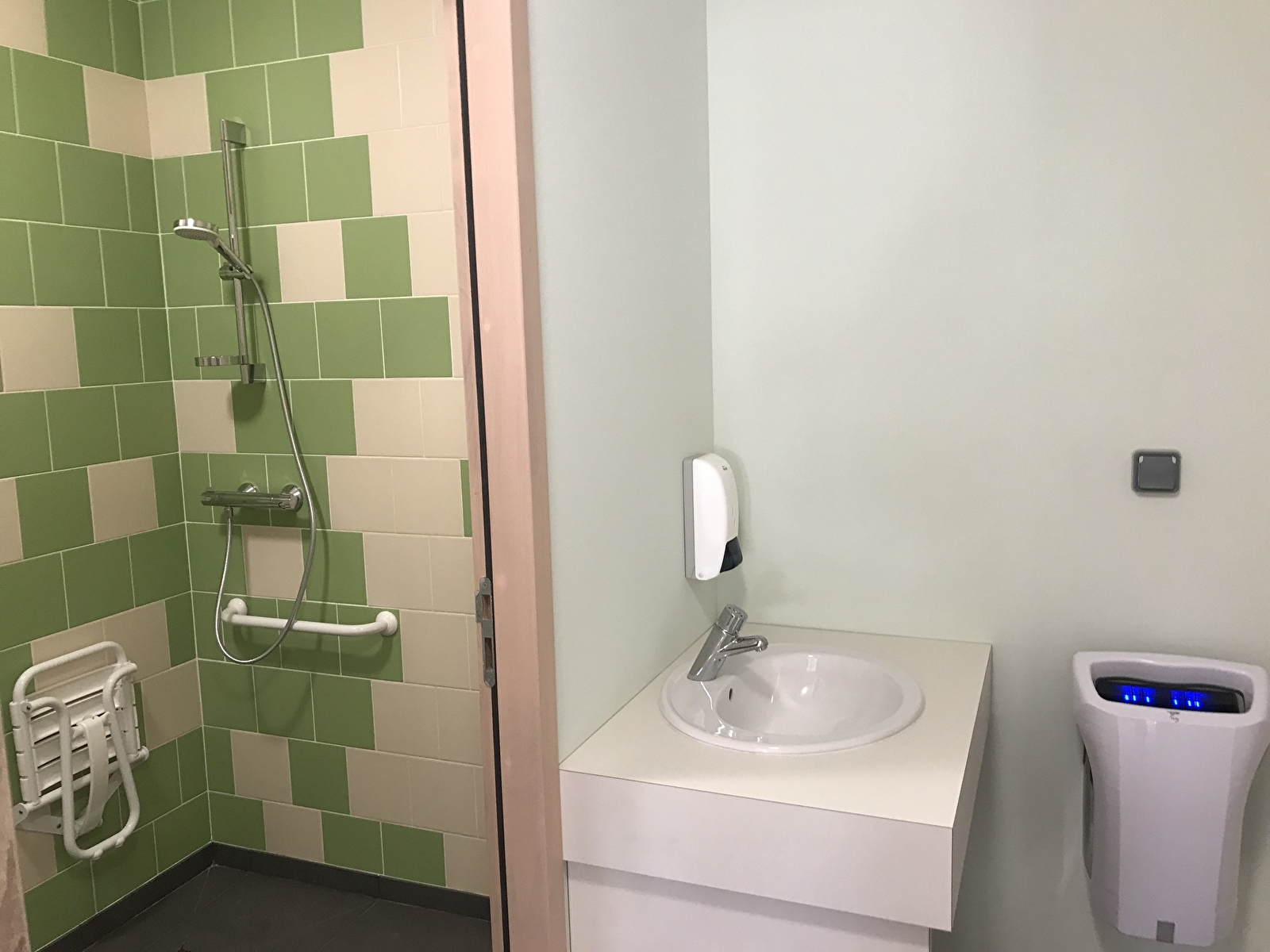 A proximité, un bâtiment est équipé de douches, sanitaires, et d'un coin cuisine avec réfrigérateur et four micro ondes. L'accès à ce bâtiment est payant, par tranche de 3h ou de 24h. Le paiement se fait grâce à une borne, uniquement par carte, qui délivre un code permettant l'accès pour une durée limitée.