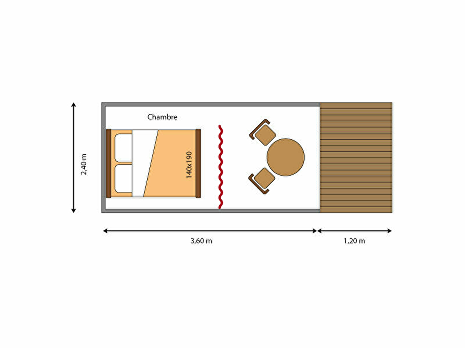 Equipée pour 2 personnes, elle contient 1 espace repas avec 1 table et 2 chaises, 1 réchaud gaz, 1 petit réfrigérateur, 1 chambre avec 1 lit de 140X190cm. La terrasse en bois de 3m2 est non couverte.