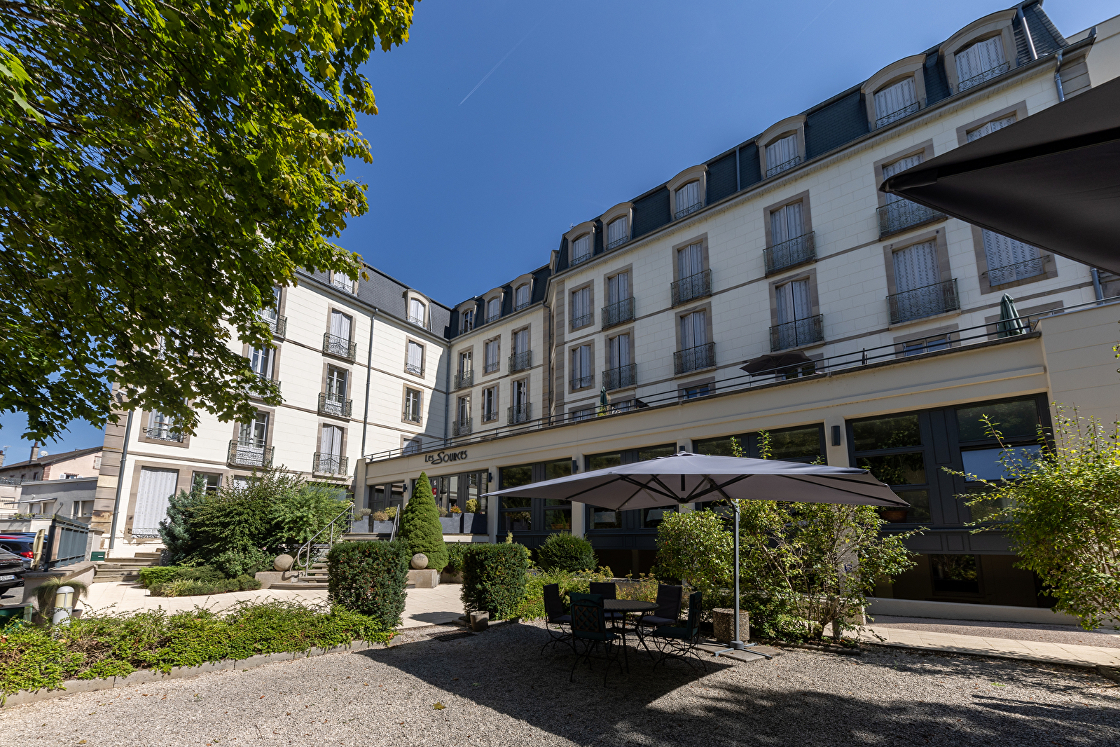 Etablissement situé face au parc thermal. Superbe bâtisse de 1860 entièrement rénovée à 100m des Thermes, tout proche du Casino, du cinéma et du centre ville historique. L'hôtel Résidence Les Sources dispose de 41 chambres studio équipées de kitchenette ; d'une salle de bains avec douche à l'italienne, wc indépendant, sèche cheveux, radiateur chauffe serviettes ; télévision écran plat avec TNT et Canal+ .
