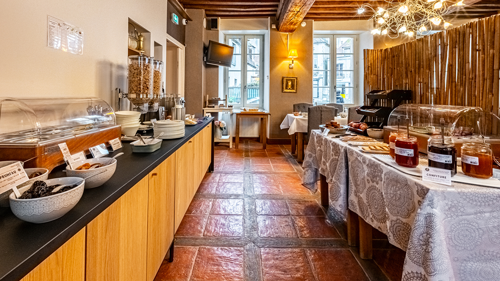 Une salle de petit-déjeuner avec plafond à la française, un petit salon attenant vous permet de pouvoir profiter d'un moment suspendu chaque matin avec un petit déjeuner sous un format buffet continental avec des produits locaux et une mise à jour régulière pour satisfaire notre clientèle.