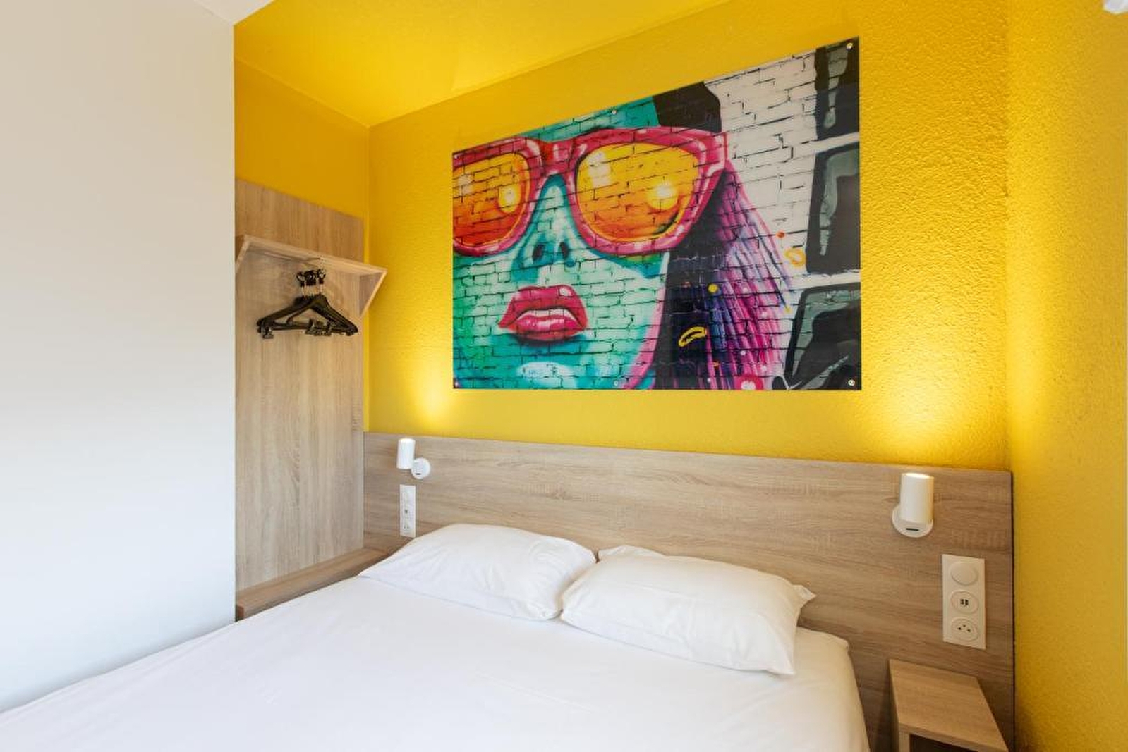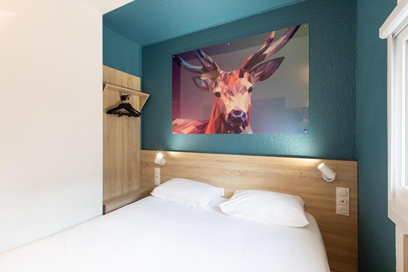 Chambres modernes et astucieuses, grand lit pour 2 personnes et lit en hauteur, lavabo, TV et réveil. Accès Wifi. Présence à l'accueil 24h/24h.