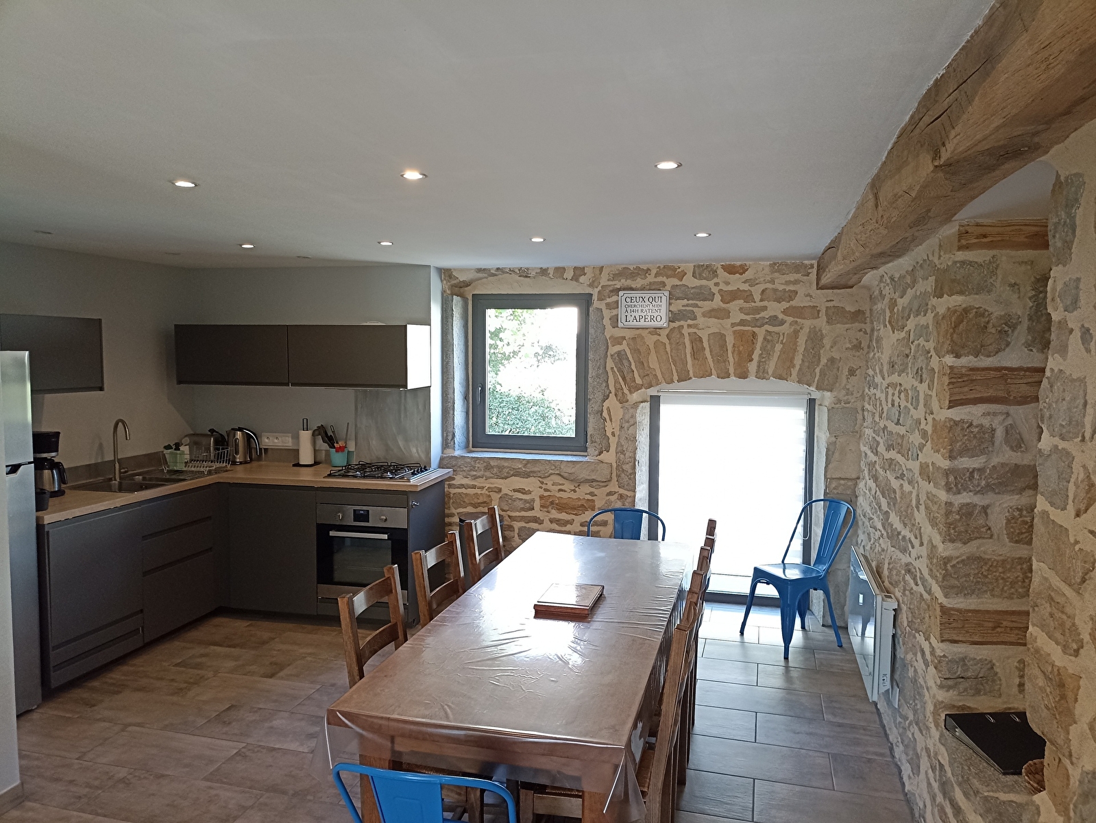 La grande baie vitrée vous laisse entrer dans le salon équipé de tout le confort moderne (tv écran plat, wifi gratuit...) mêlé au charme des murs en pierres et des poutres.