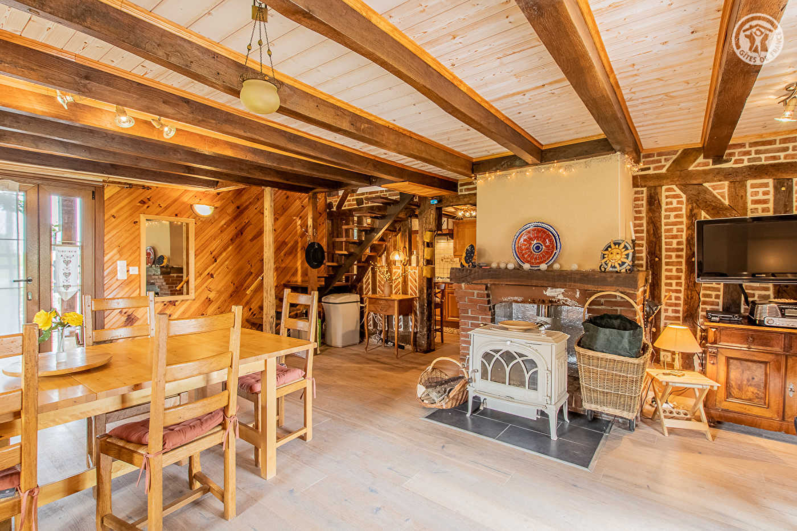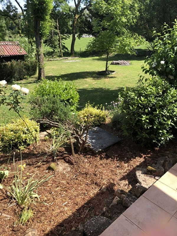Composition : Maison mitoyenne à l'habitation propriétaires (indépendance totale sans vis-à-vis). Wifi. Chauffage poêle à bois. Rdc : séjour-cuisine-salon, salle d'eau (douche/Wc). 1er étage : 2 espaces couchage délimités avec rideaux et cloisons ouvertes en partie haute (lit 2 p. 160x190cm / 2 lits 1 p. 90x190cm), 1 chambre (lit 2 p. 160x190cm), coin salon (conv. BZ 2 p. 140x190cm en appoint), Wc indépendant. Double terrasse + jardin 700m² + parking privés. Local vélos. Vélos + remorque enfants (gratuit). Commodités 11 km. Gare 27 km.