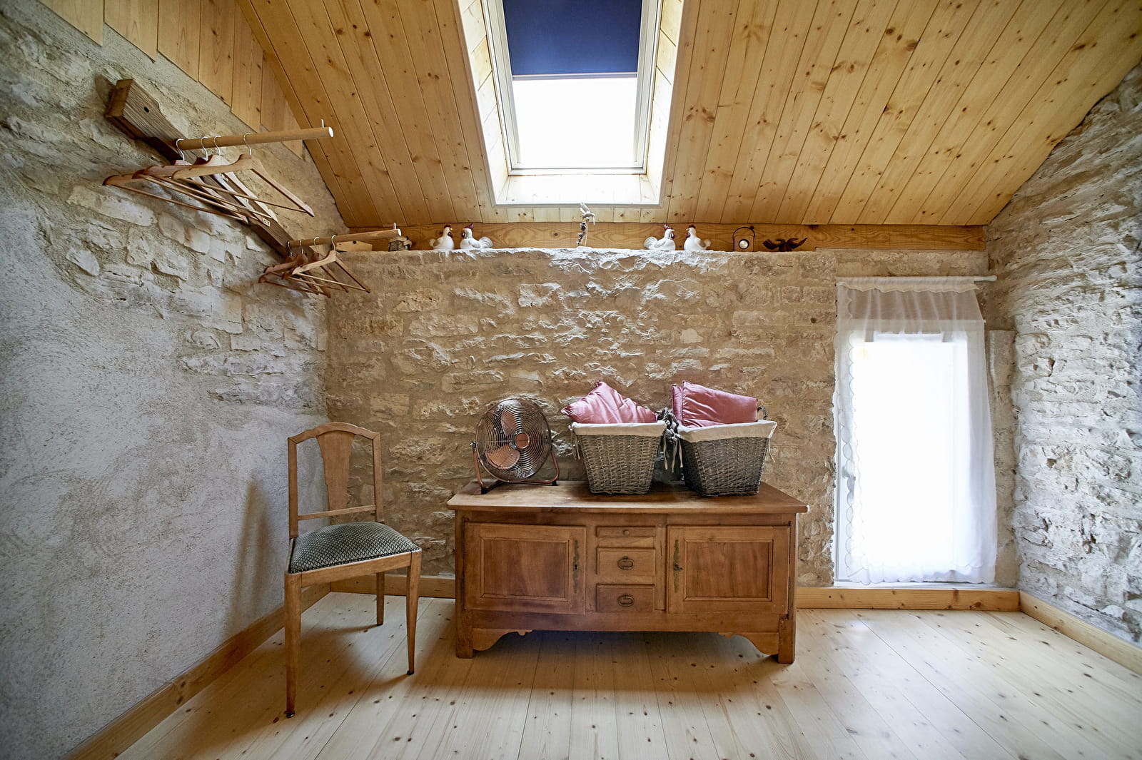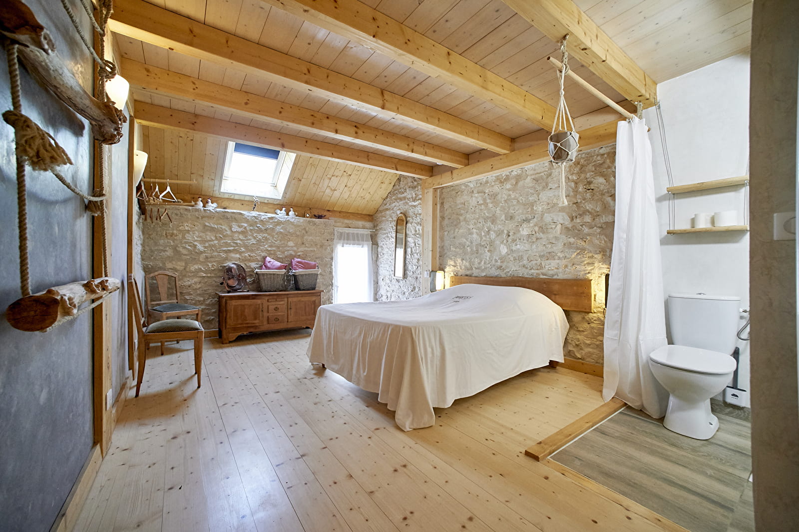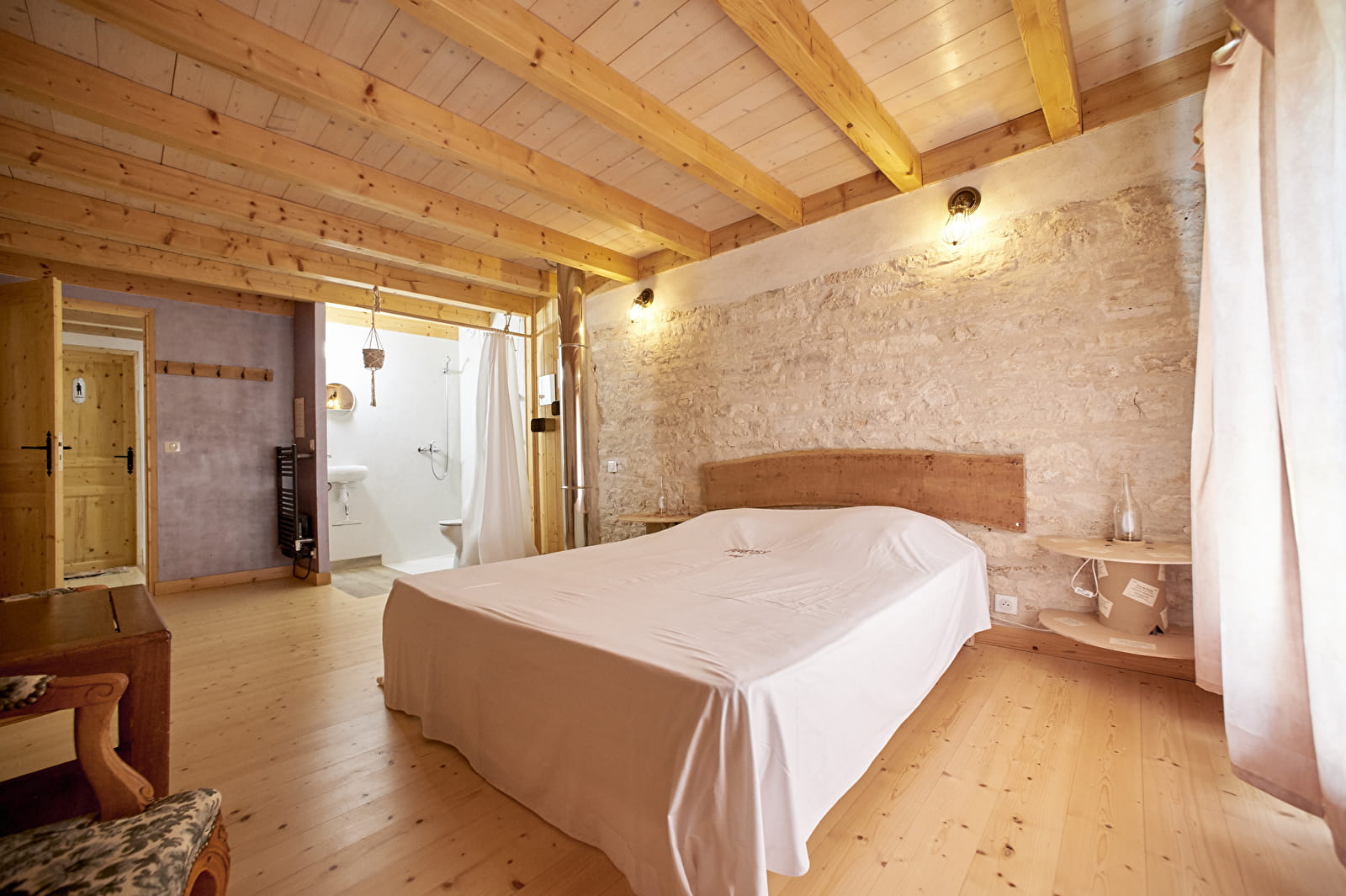 Les matériaux bruts et naturels, comme le bois et les pierres apparentes, ainsi que des meubles relookés, créent une ambiance cocooning. Charme, simplicité et poésie se mêlent dans cette maison de campagne rénovée.