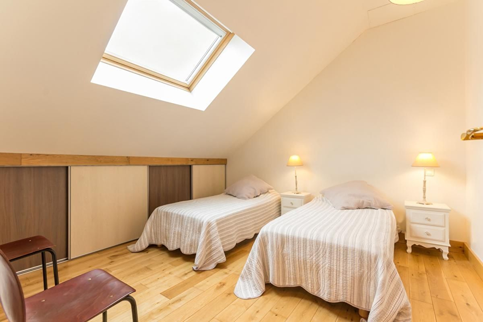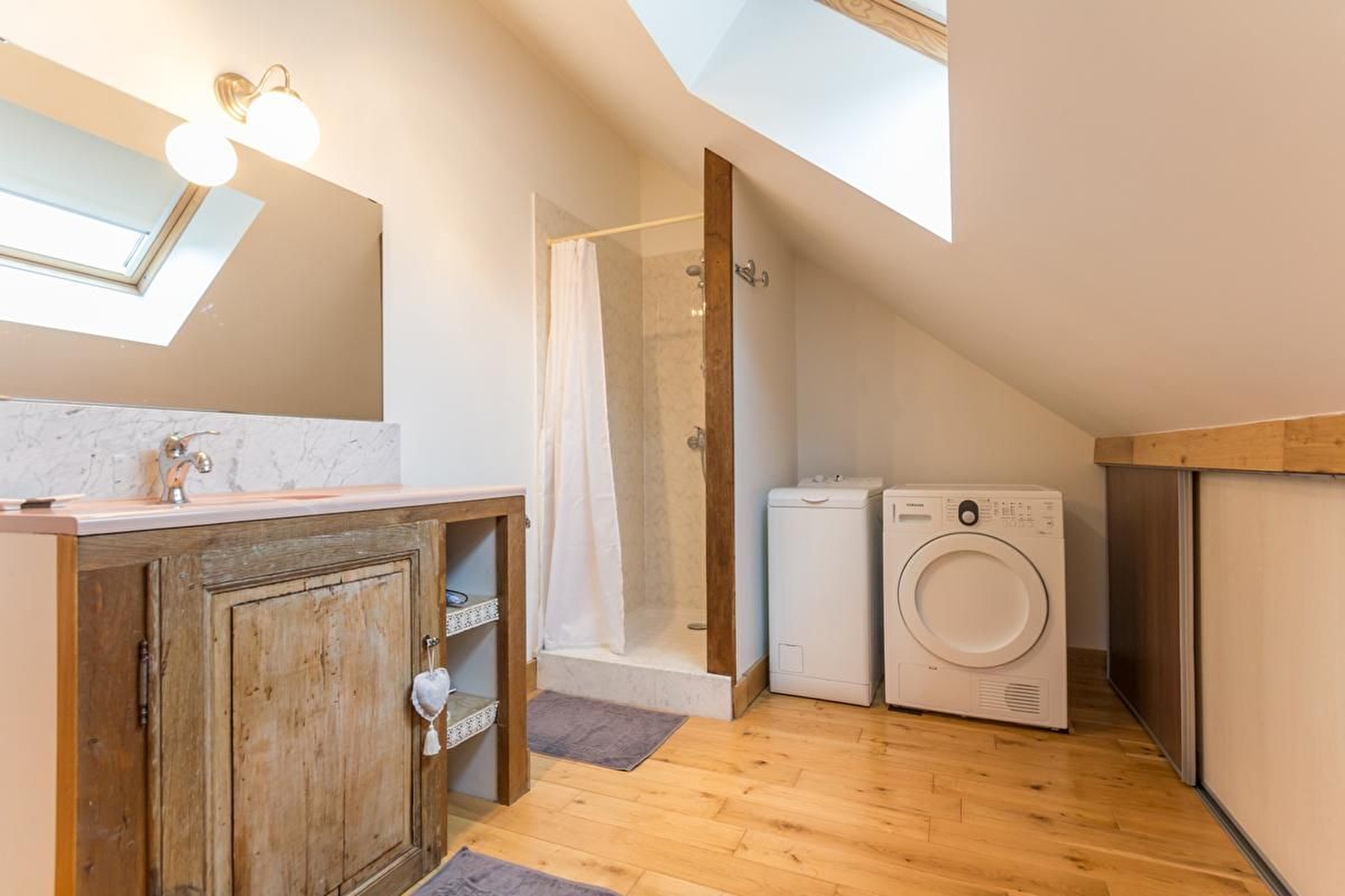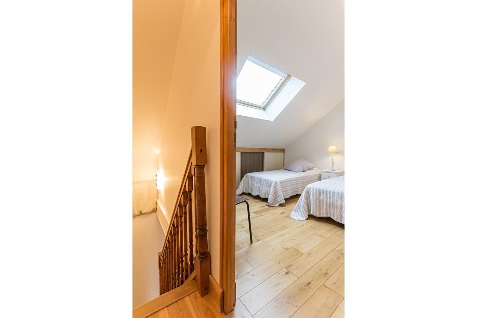 A l'étage : une chambre avec 2 lits 90 jumelables et une grande salle d'eau avec douche et WC.