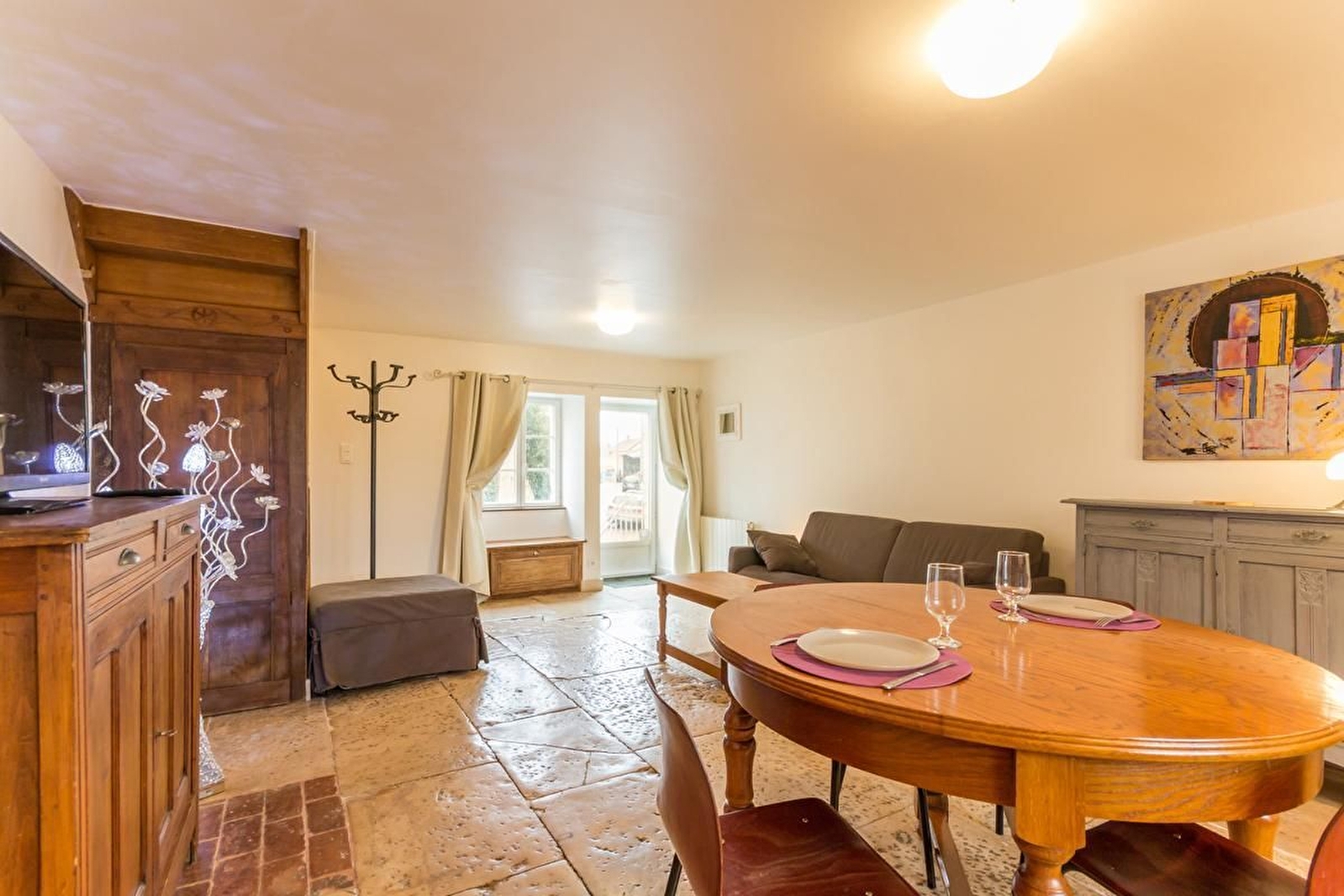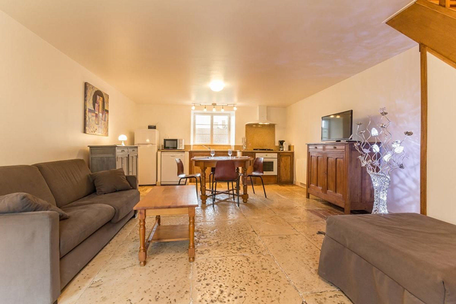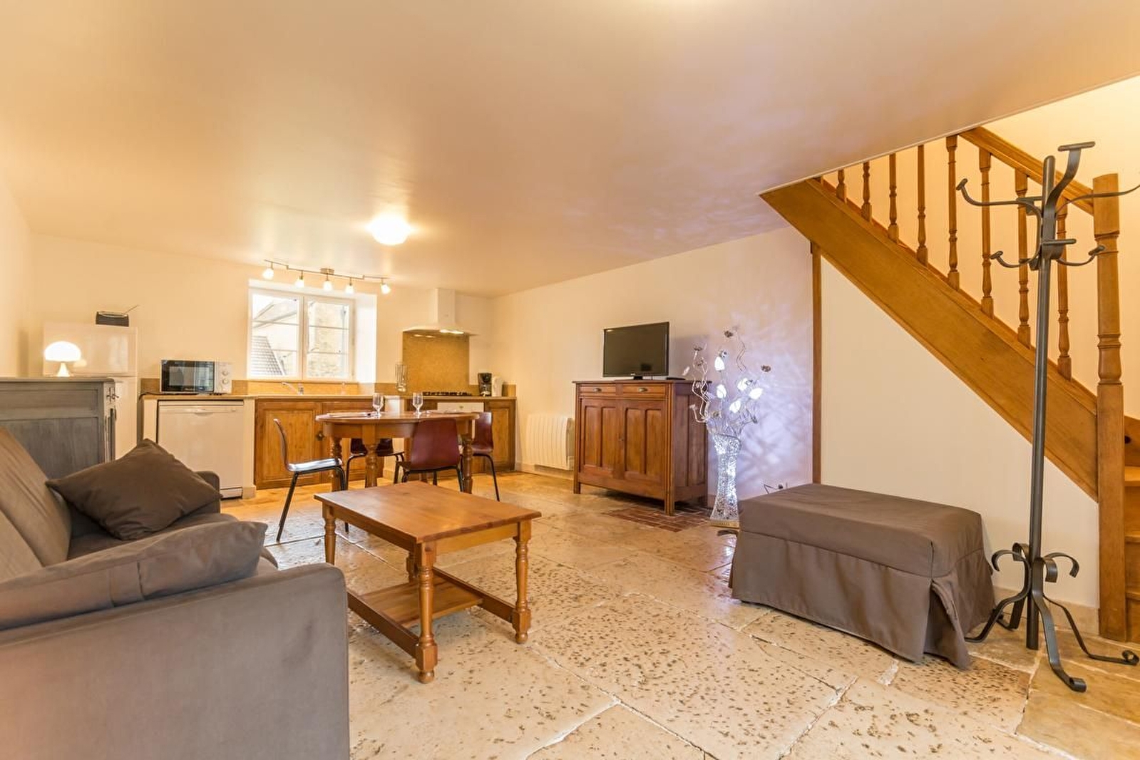 En rez-de-chaussée surélevé, il offre un séjour avec dalles de Bourgogne au sol : coin cuisine ouverte sur la salle à manger et le salon avec canapé convertible de très bonne qualité.