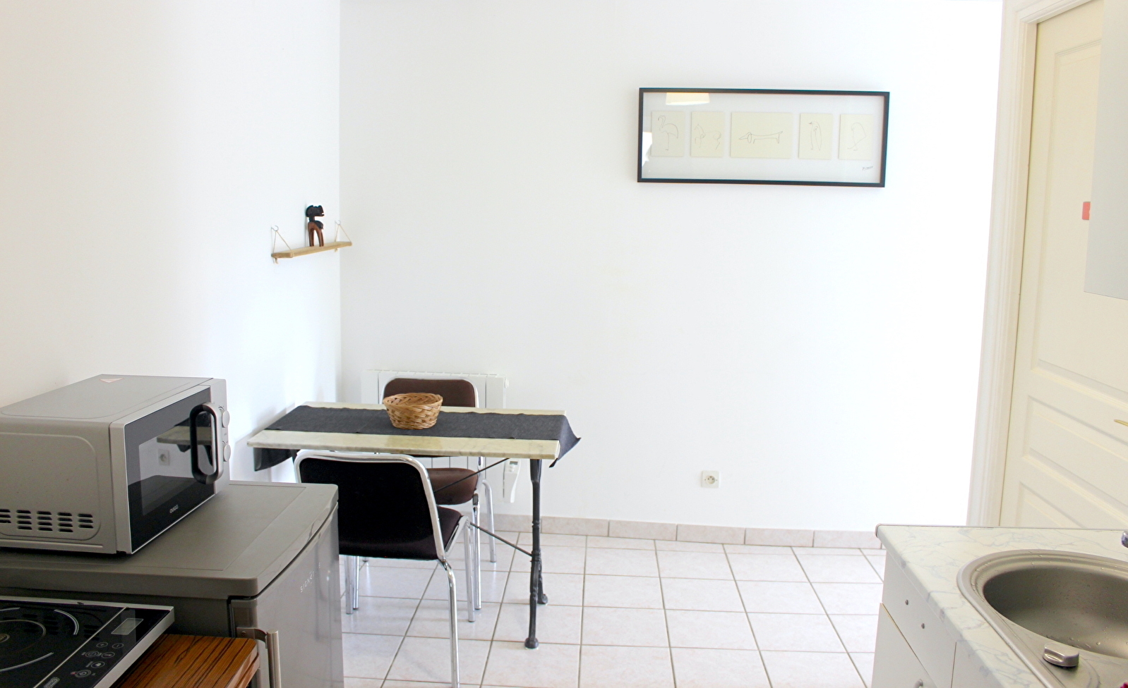 Lit double confortable (2 places), kitchenette équipée (micro onde, plaque de cuisson, cafetière presse...), salle de bain douche.