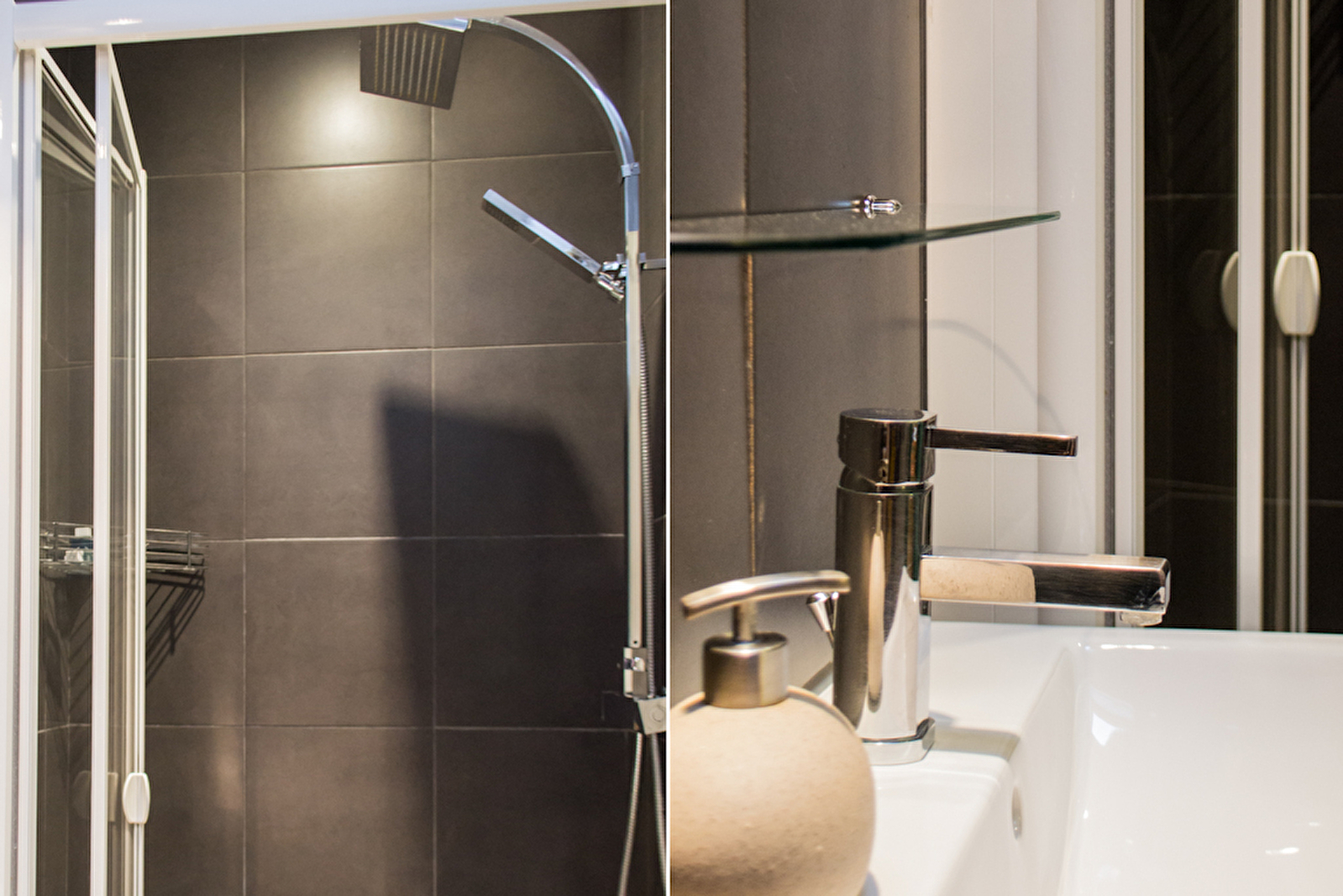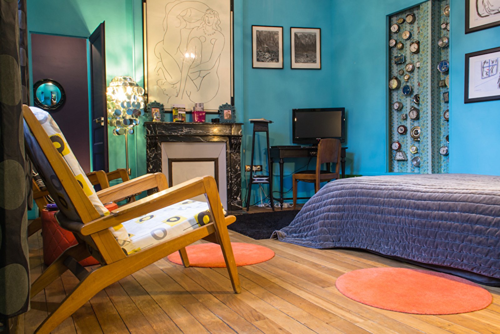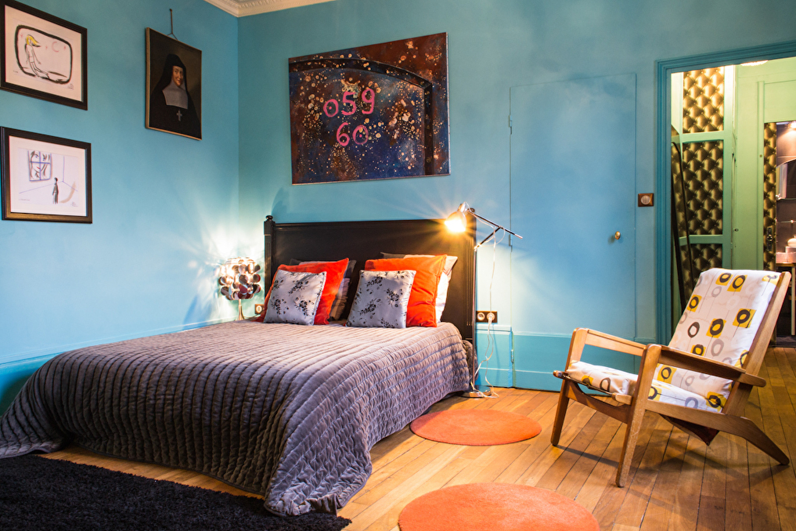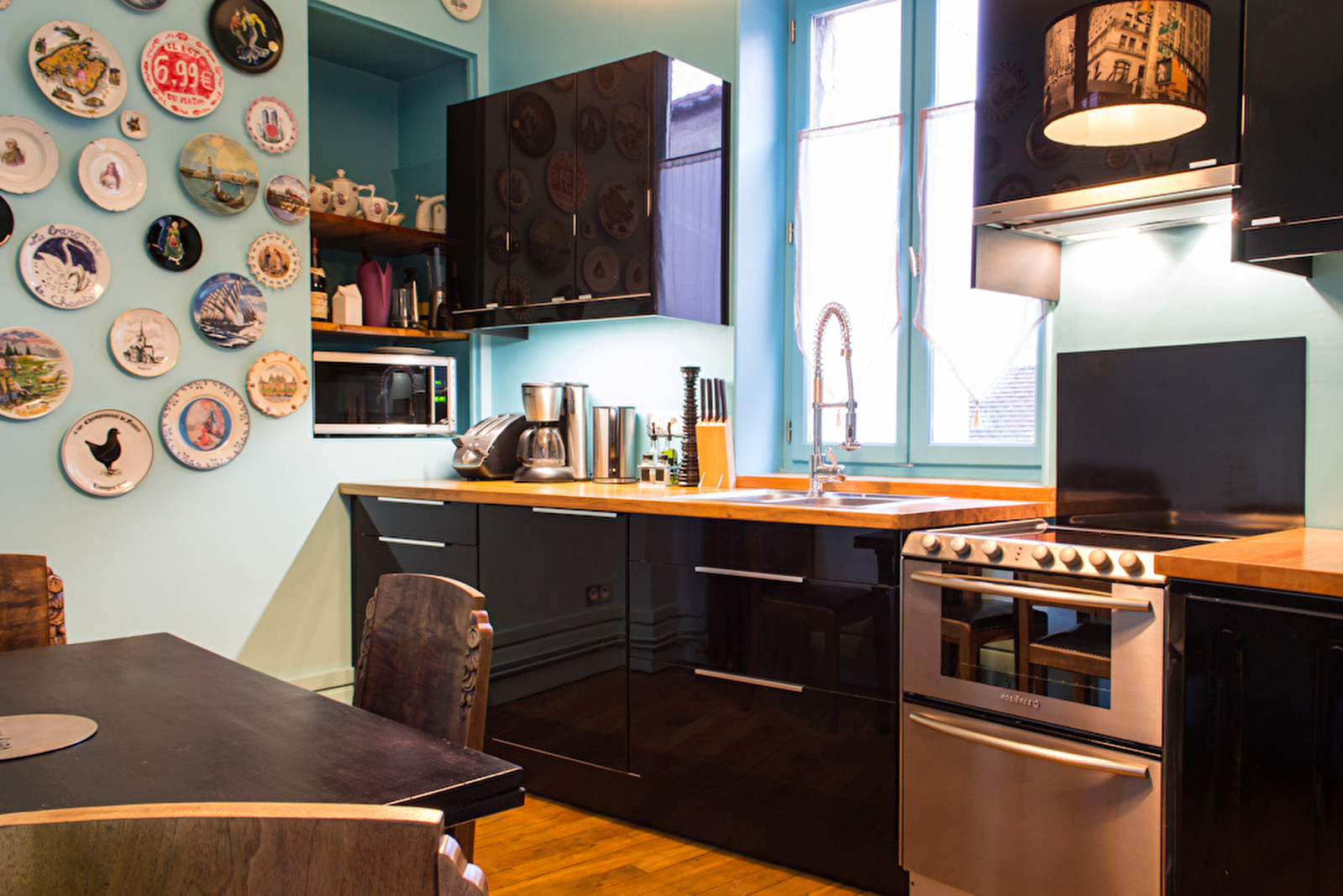 Cet appartement au deuxième étage est très coloré. Ses murs turquoises et ses meubles noirs lui donnent un côté Pop. Très ensoleillé, avec une très belle vue sur les rues du vieux Dijon. La cuisine est spacieuse et agréable.