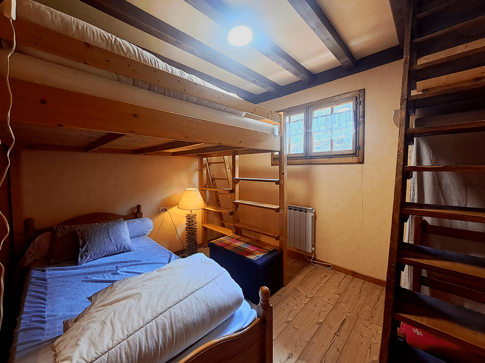 Appartement de 50m2 au 1er étage d’un chalet, composée d’une pièce principale avec canapé, cheminée et coin repas, coin cuisine ouvert sur le séjour. L’espace nuit est composée de 2 chambres, l’une avec un lit en 140 et l’une avec un lit 90 superposés à un lit en 140.