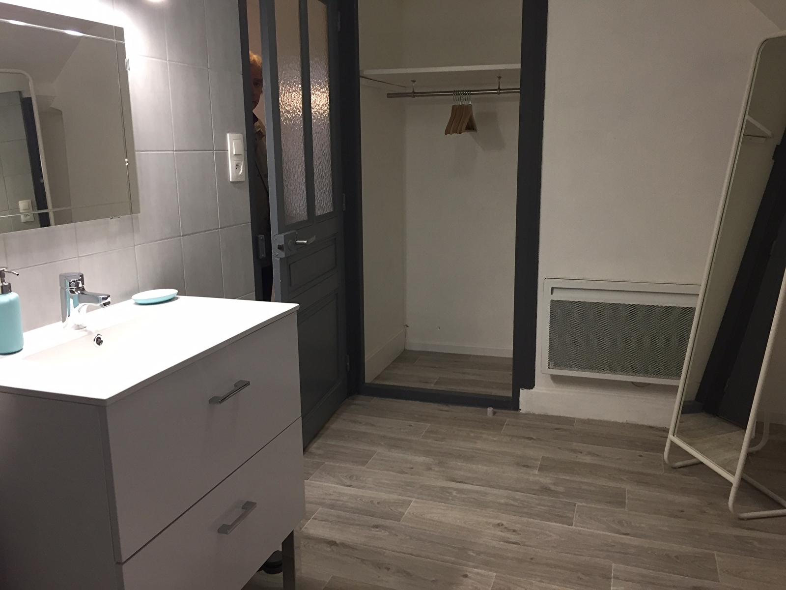 Un escalier de 4 marches donne accès à une salle de bains avec lavabo et douche , placard et penderie. WC indépendant. Absence d'ascenseur.