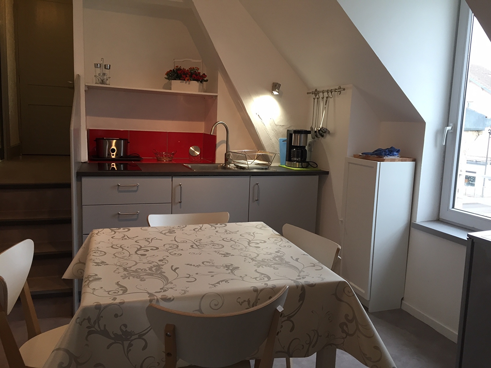 La pièce principale est une cuisine entièrement équipée où 4 personnes peuvent prendre leur repas. Celle-ci dessert 2 chambres : 1 avec 1 lit 140, 1 avec 2 lits 90.