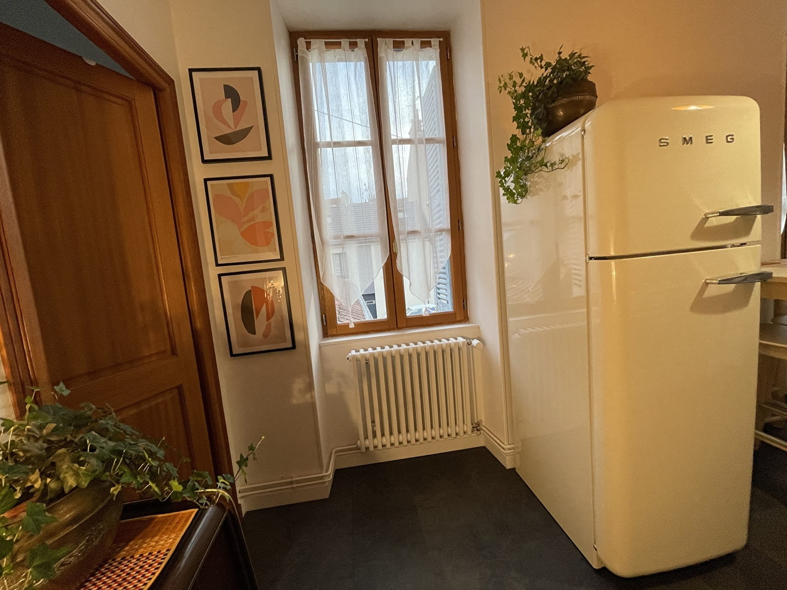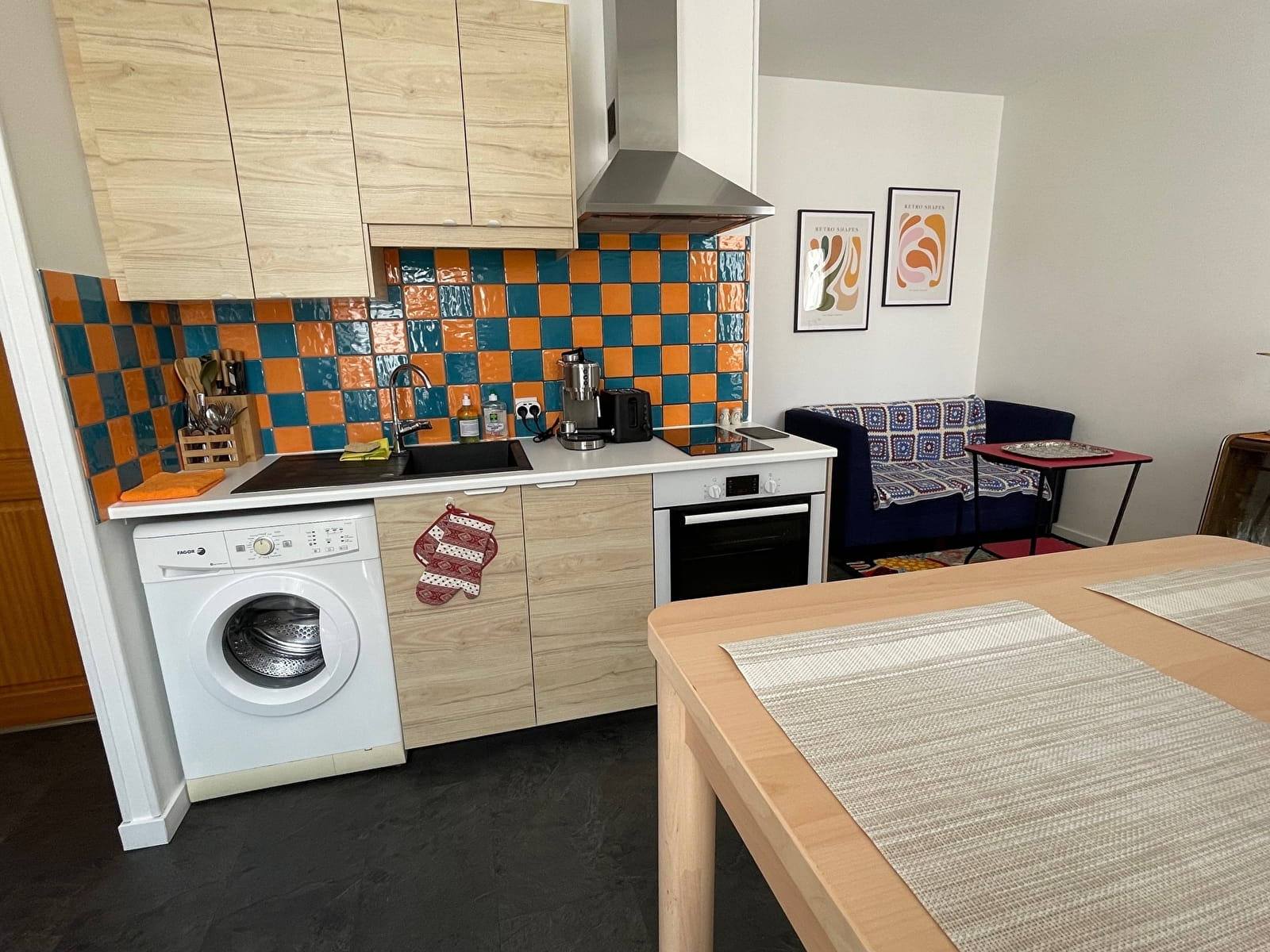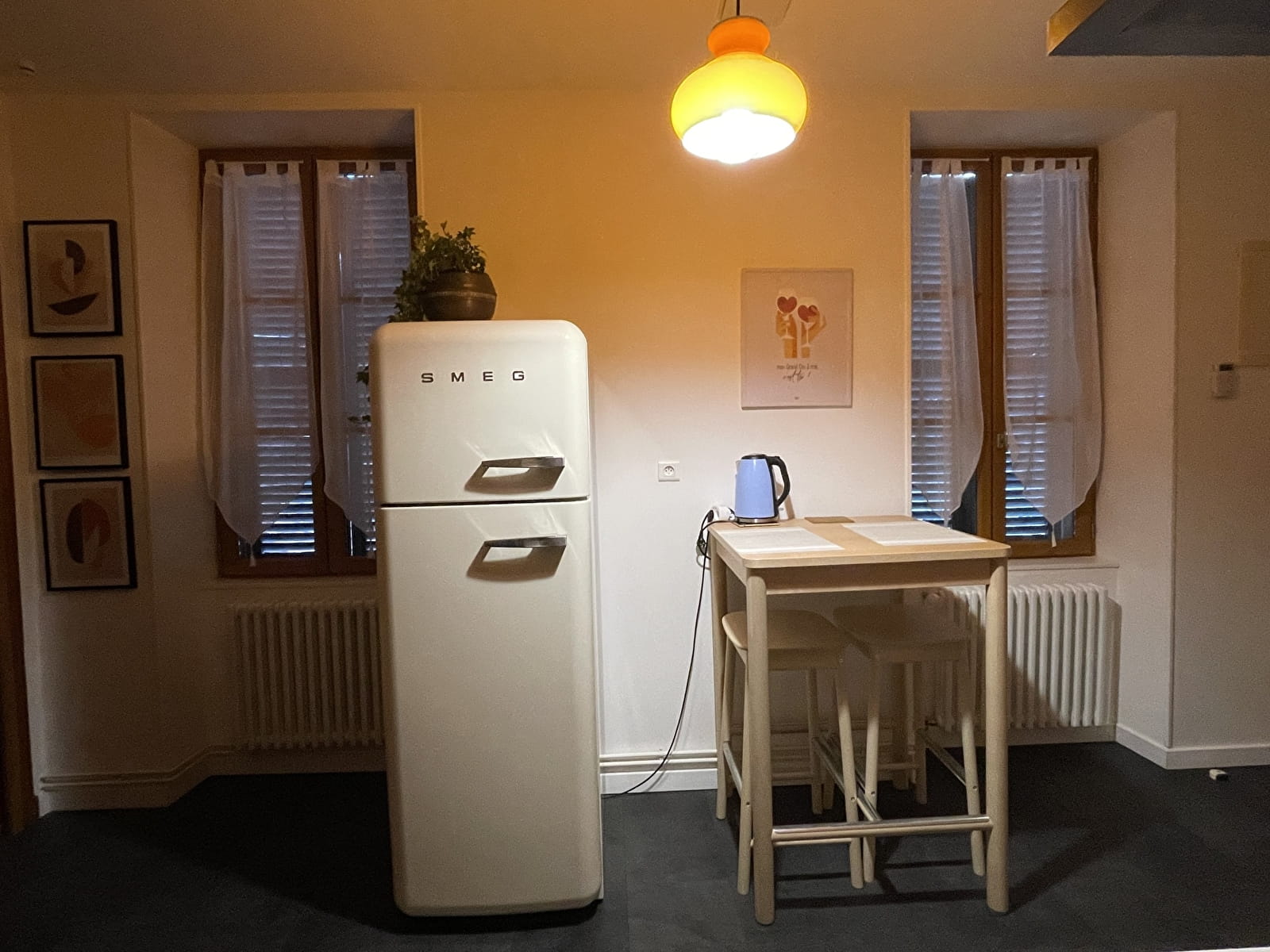 Nous avons apporté un soin particulier à la décoration et à l'équipement qui vous feront vous sentir le plus confortable possible. Tous les équipements sont prévus: four, plaque vitrocéramique, frigidaire-congélateur SMEG, théière, cafetière espresso, grille-pain, lave-linge, fer à repasser, sèche cheveux... produits de première nécessité. Wifi fibre. Une chambre (lit queen size) avec bureau, coin salon, salle de bain, toilette, cuisine aménagée. Situé au 1er étage sans ascenseur. Possibilité d'entreposer des vélos dans le garage attenant.