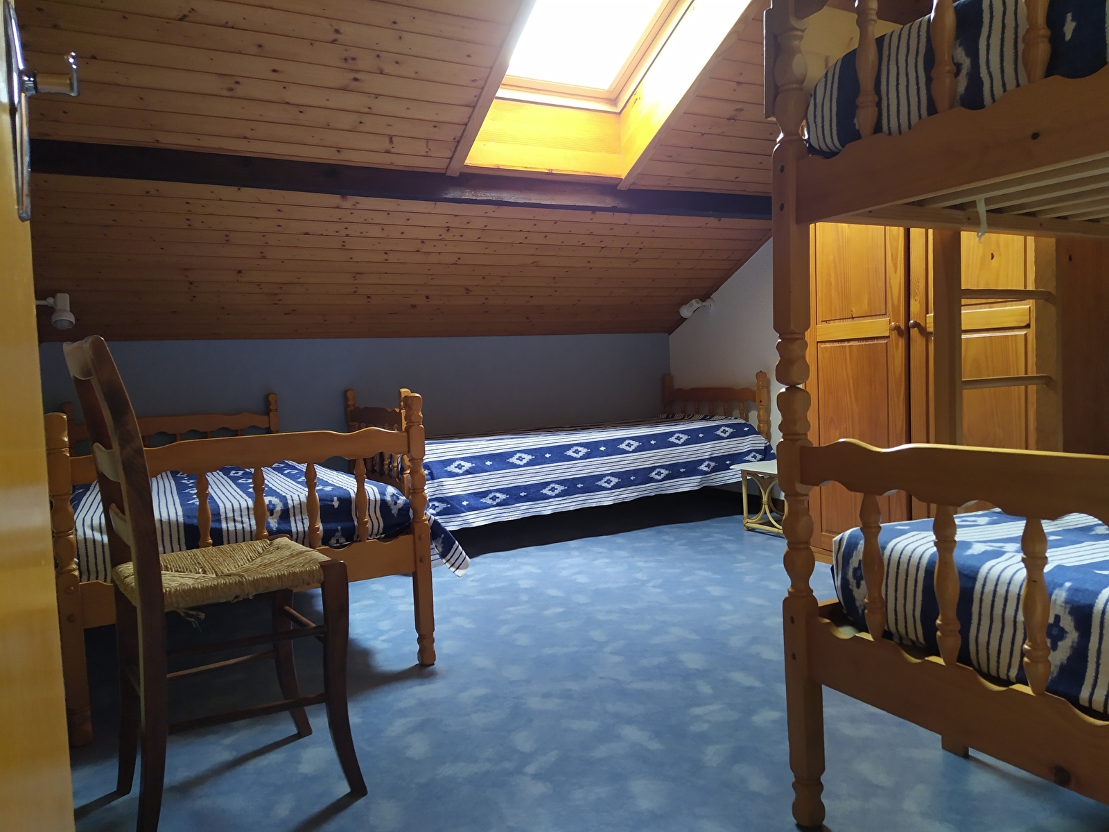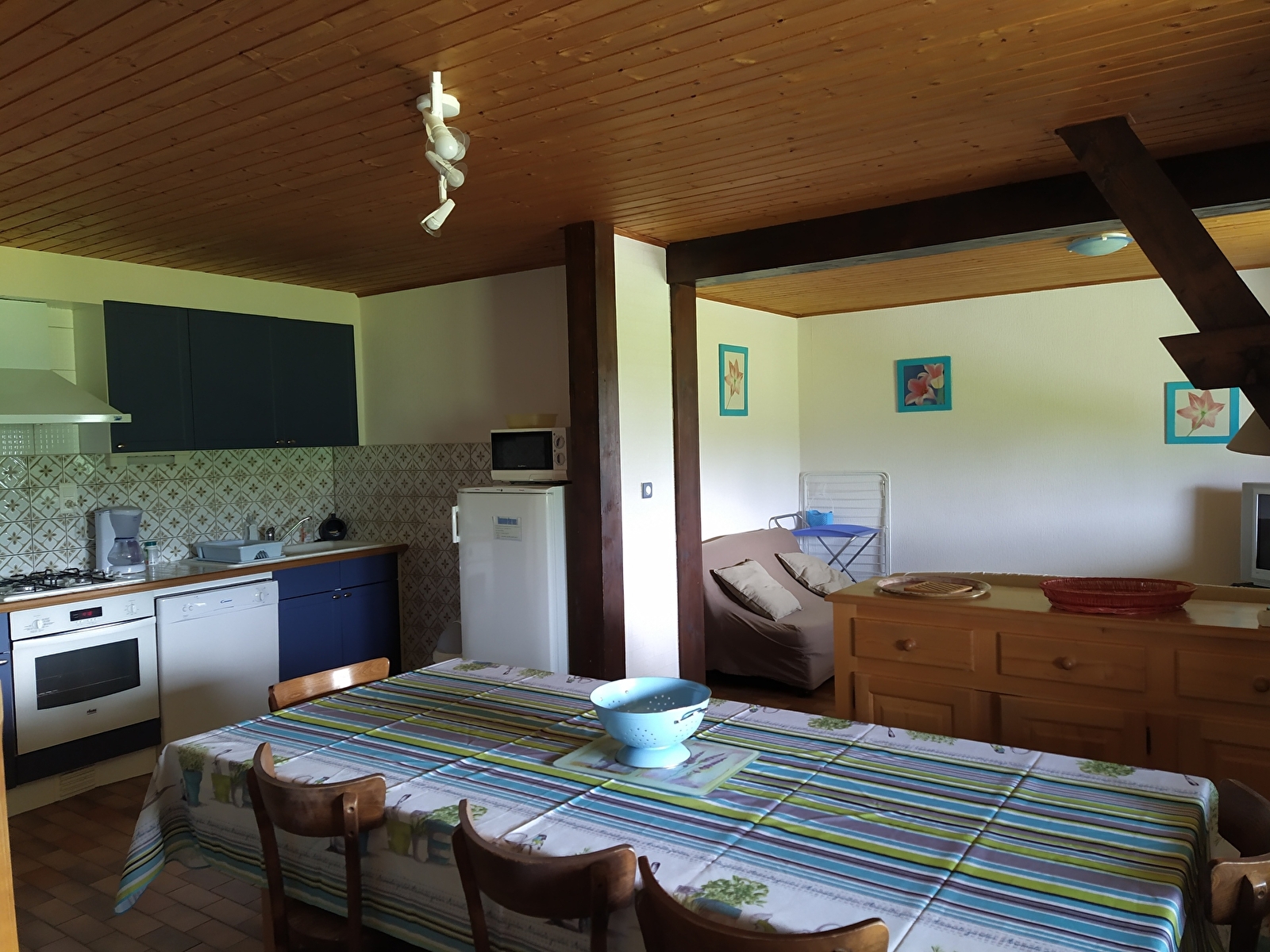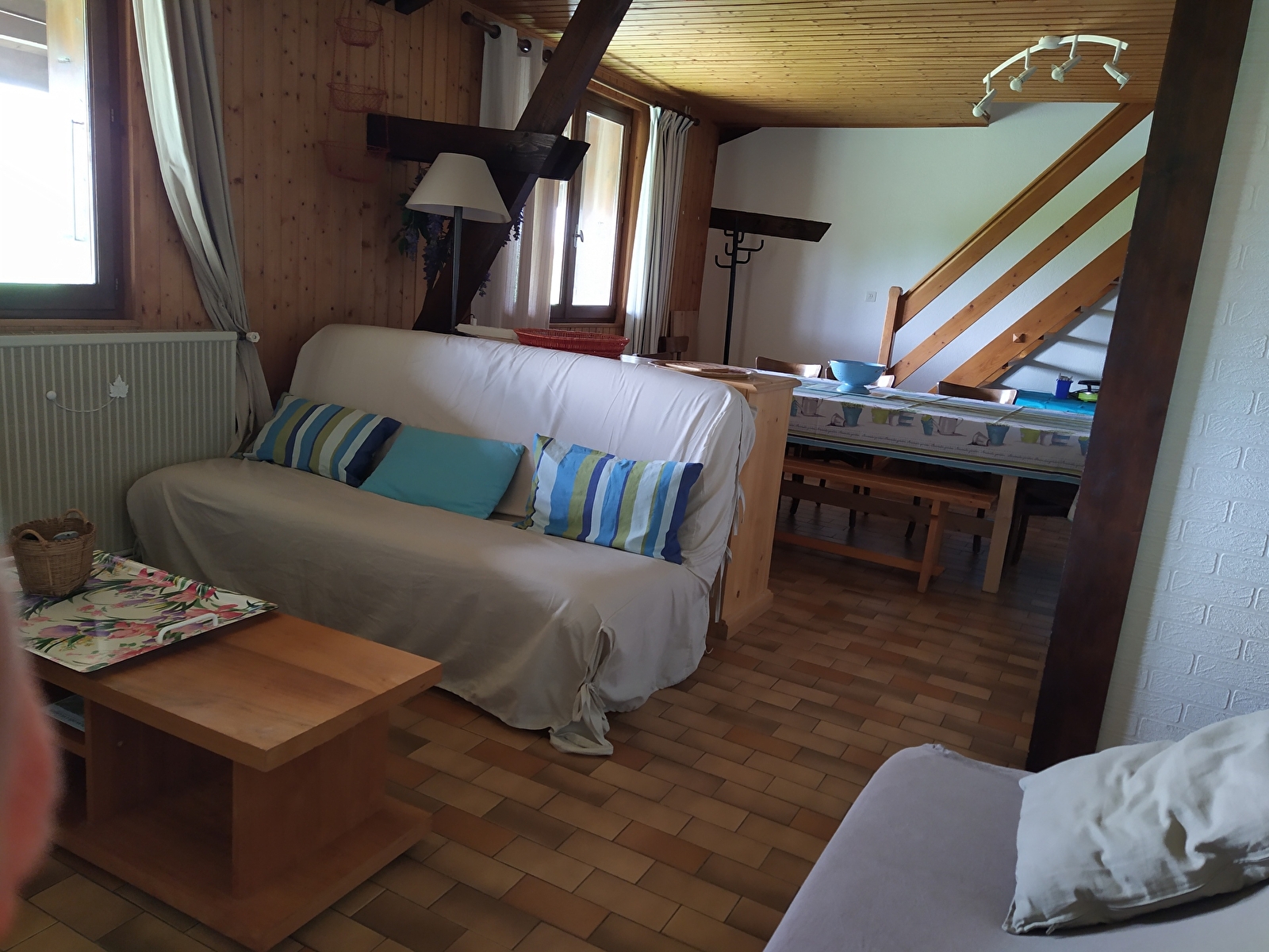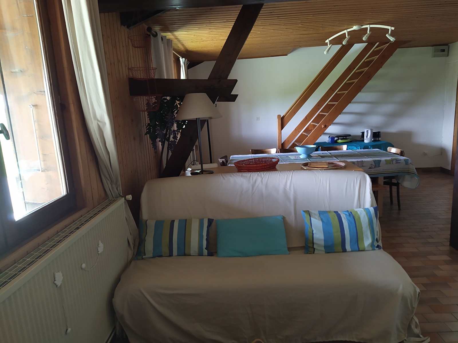 Situé dans une grande maison contenant 5 autres logements, cet appartement de 58m² au 1er étage est composé d’une pièce principale avec coin cuisine/repas, canapé lit clic-clac. Une première chambre avec lit de 140cm et une seconde avec lits superposés de 90cm et deux lits de 80cm. Salle d’eau et WC indépendant. Un accès extérieur sur grand terrain non clos complète le tout. Stationnement privée à la maison.