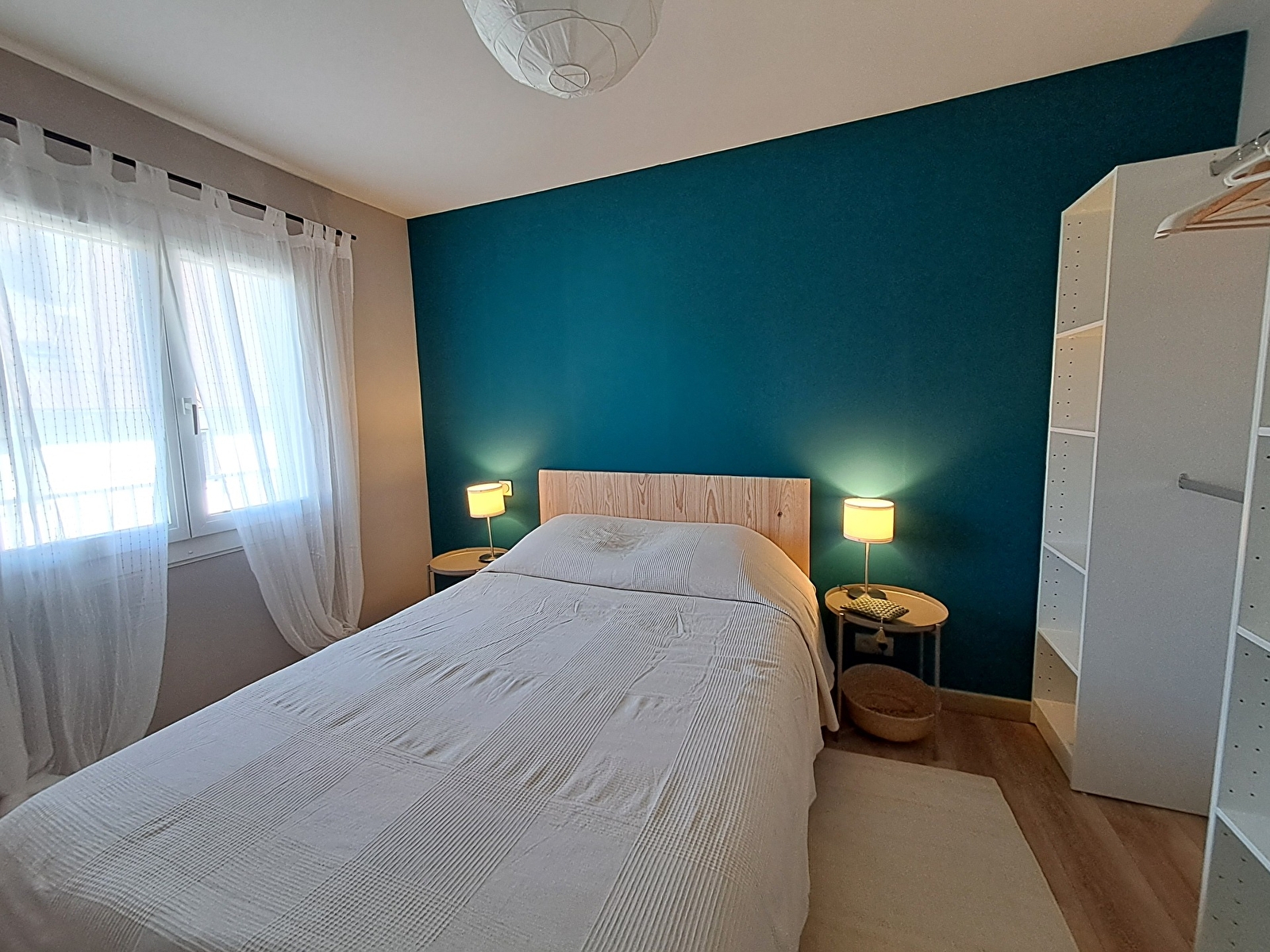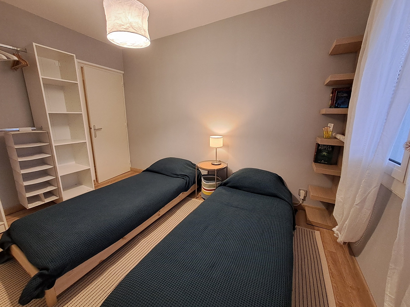 Une chambre avec un lit double en 140cm et d'une seconde chambre avec 2 lits en 80cm.