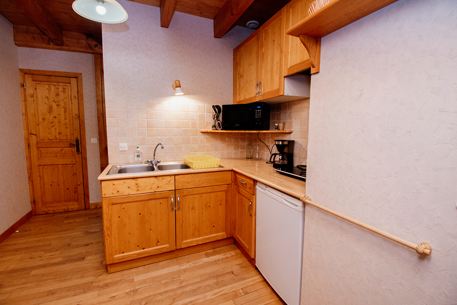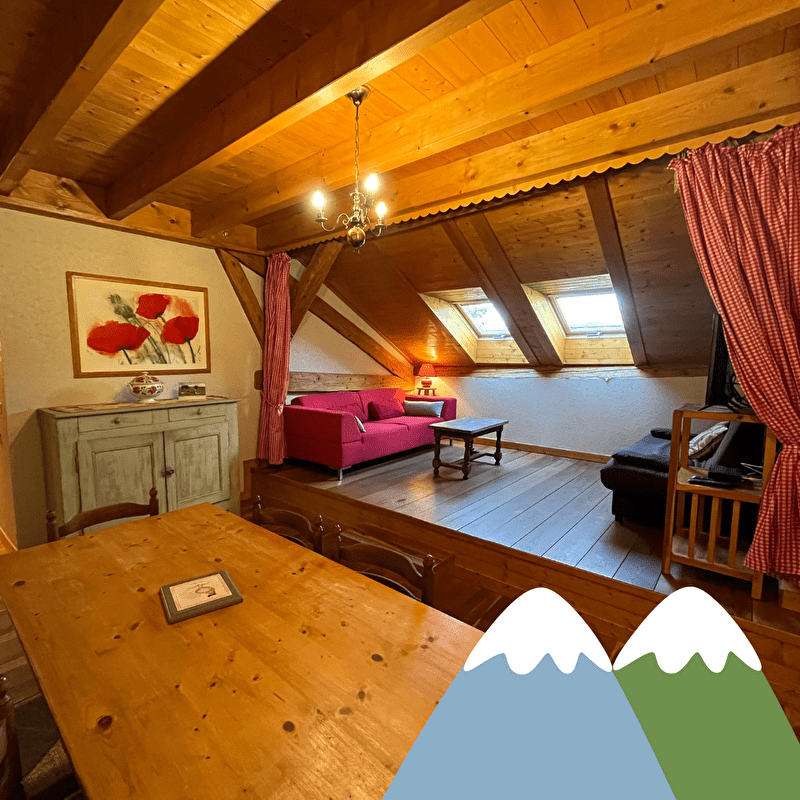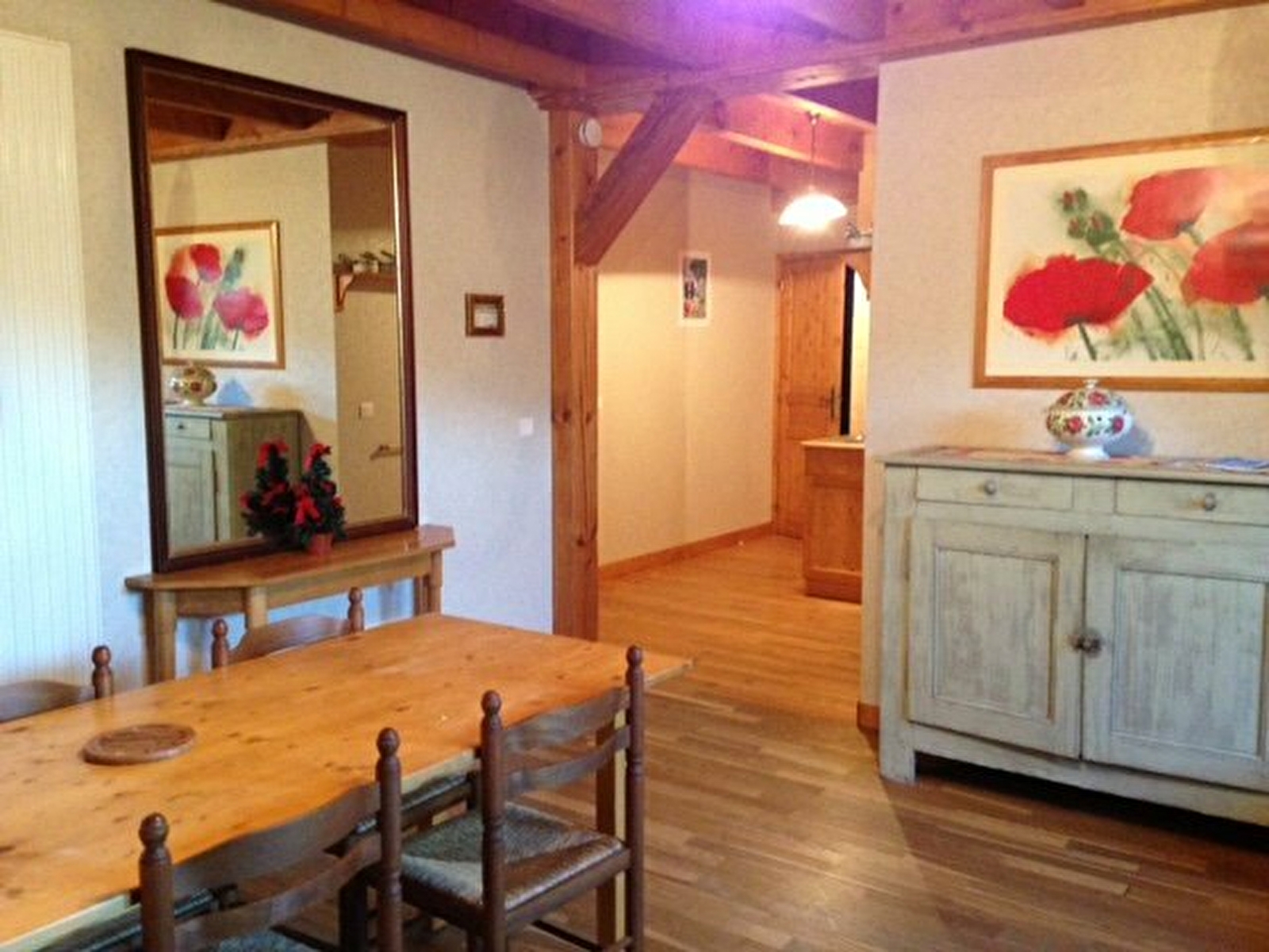 Situé au milieu de la ferme, l'appartement se compose d'une grande salle de vie avec coin cuisine, espace repas et salon avec canapé lit pouvant être séparé par un rideau, et aussi d'une chambre avec un lit double et un lit simple, une salle de bain avec douche et un wc séparé.