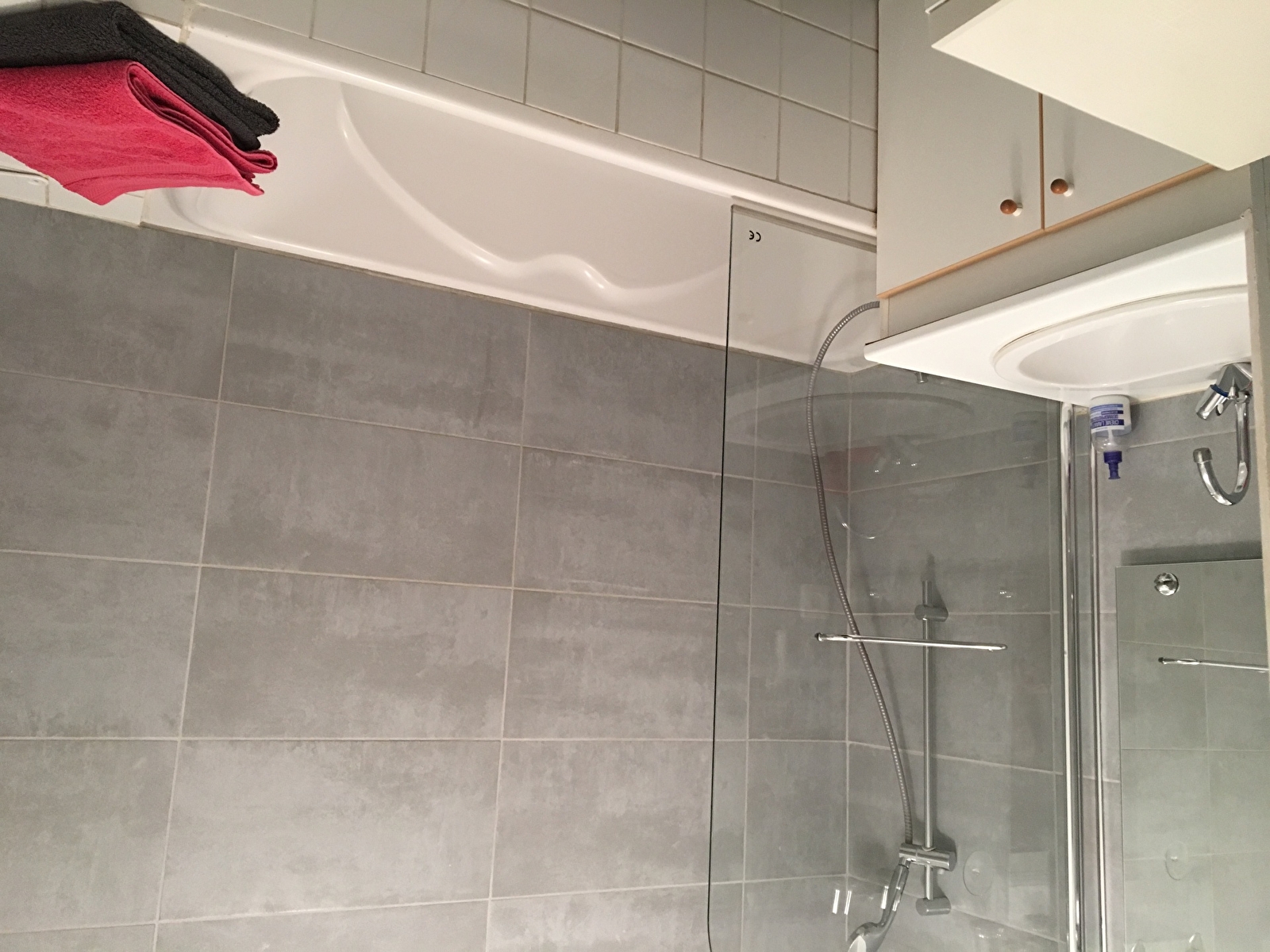 Vous trouverez également du gel douche, un sèche cheveux et des plaques à lisser dans la salle de bains.