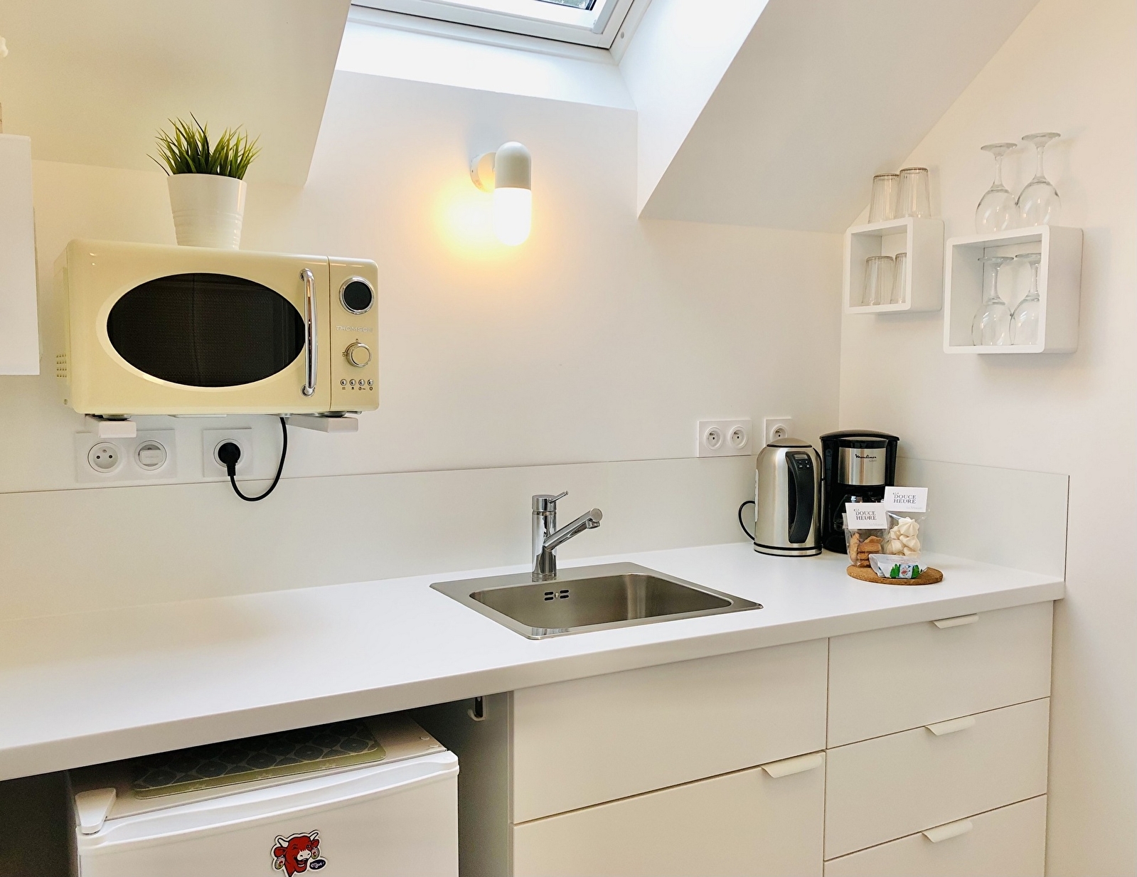 - Kitchenette (frigo, plaque induction 1 feu, four micro-ondes, cafetière, grille pain, vaisselle…)