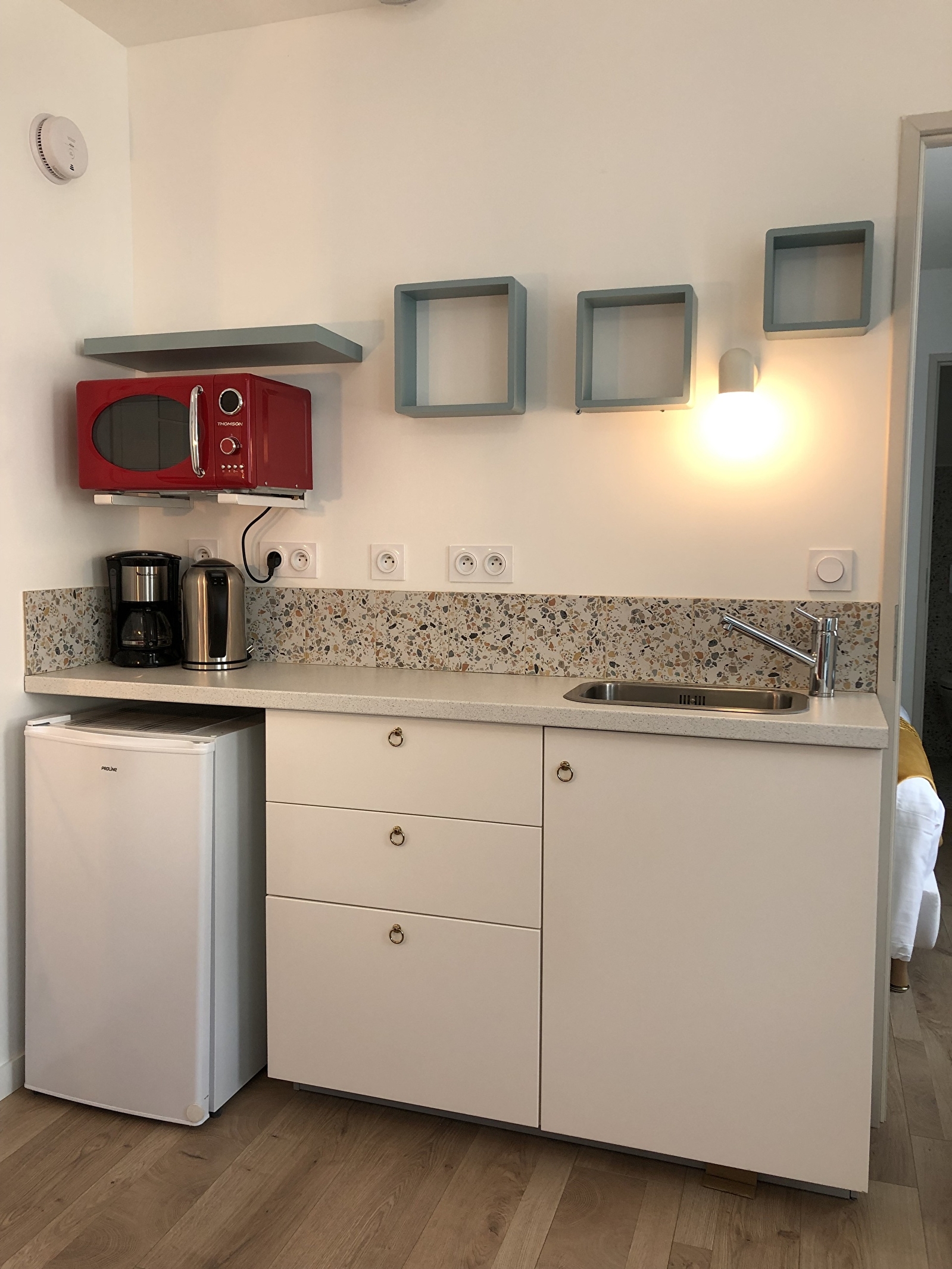 - Kitchenette dans les logements de 2 pièces (frigo, plaque induction 1 feu, four micro-ondes, cafetière, grille pain, vaisselle…)