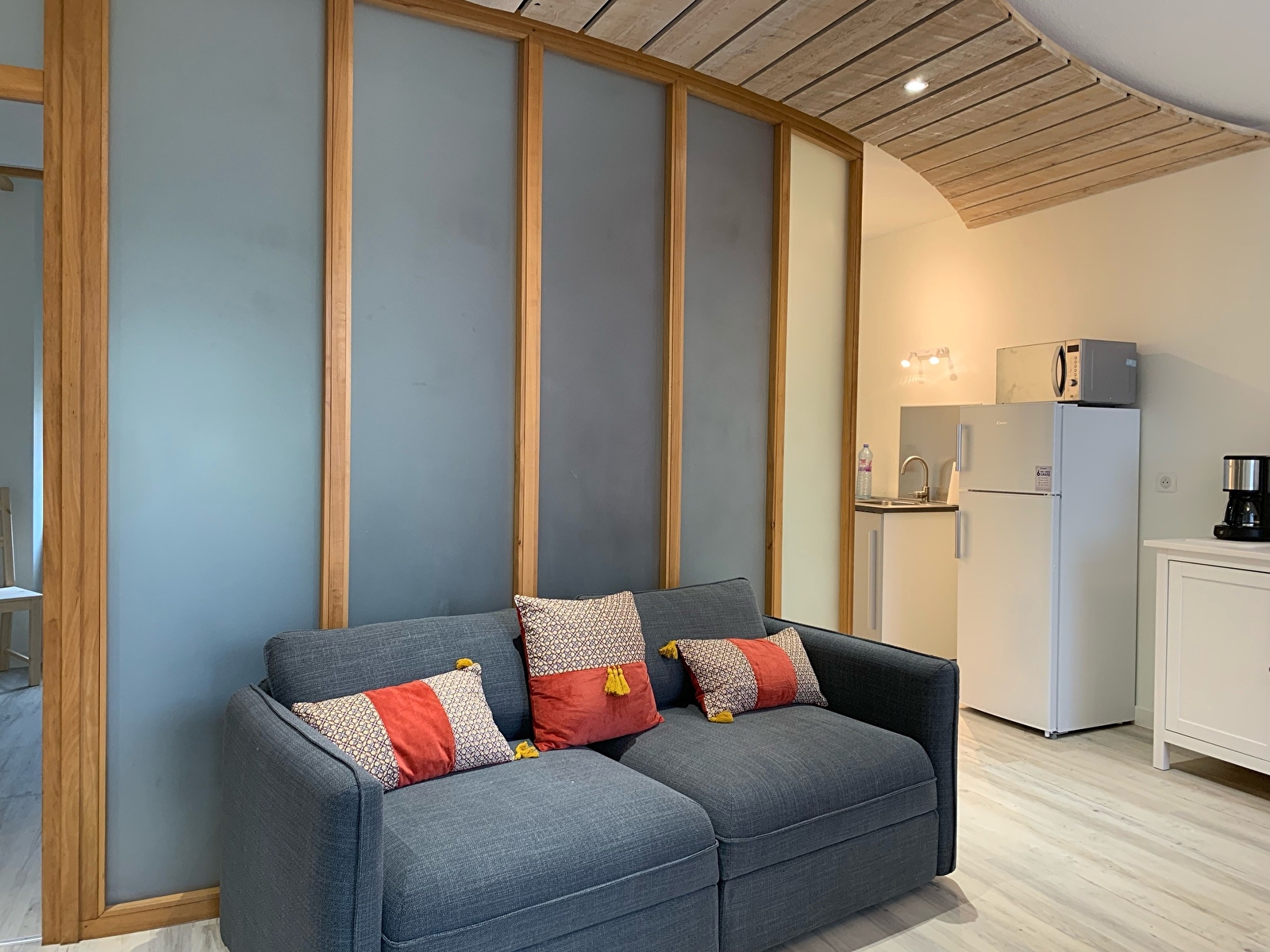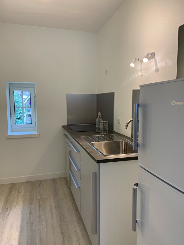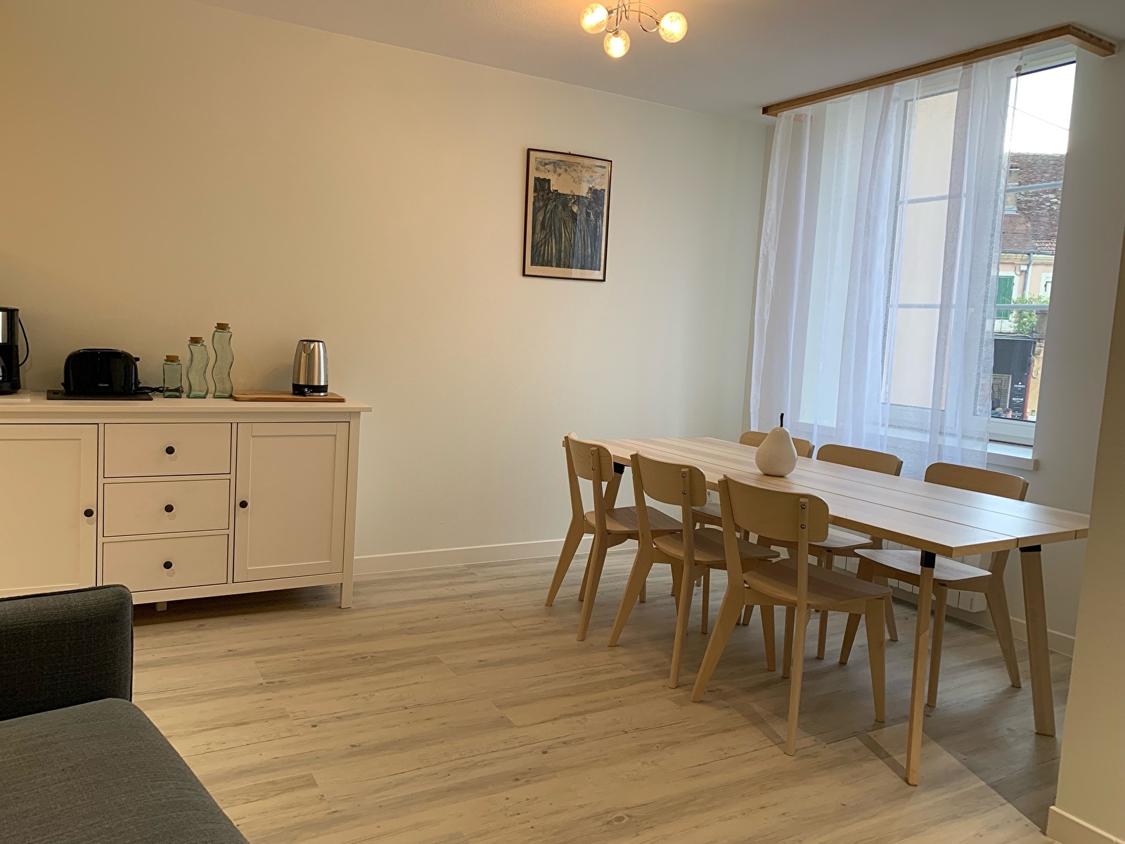 Appartement meublé au cœur de ville. Comprenant :séjour avec cuisine : Evier / Plaque vitrocéramique / Micro-onde / Réfrigérateur / Cafetière / Bouilloire + coin repas pour 6 personnes