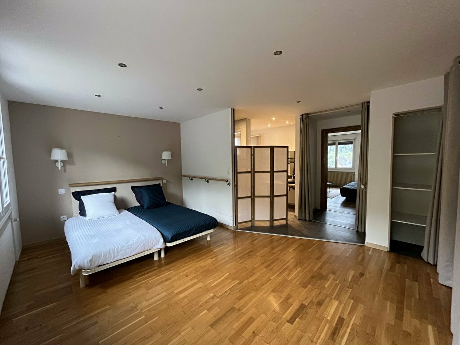 Vous y trouverez une cuisine équipée, un salon séjour avec une banquette convertible, un toilette, une chambre avec deux lits de 90x190 cm pouvant être réunit en un seul, elle est également composée de grands rangements et de la seule salle d'eau du gîte. Il est possible de créer de l'intimité par le biais d'un paravent (cf. photos). Une grande partie est accessible pour les personnes à mobilité réduite.