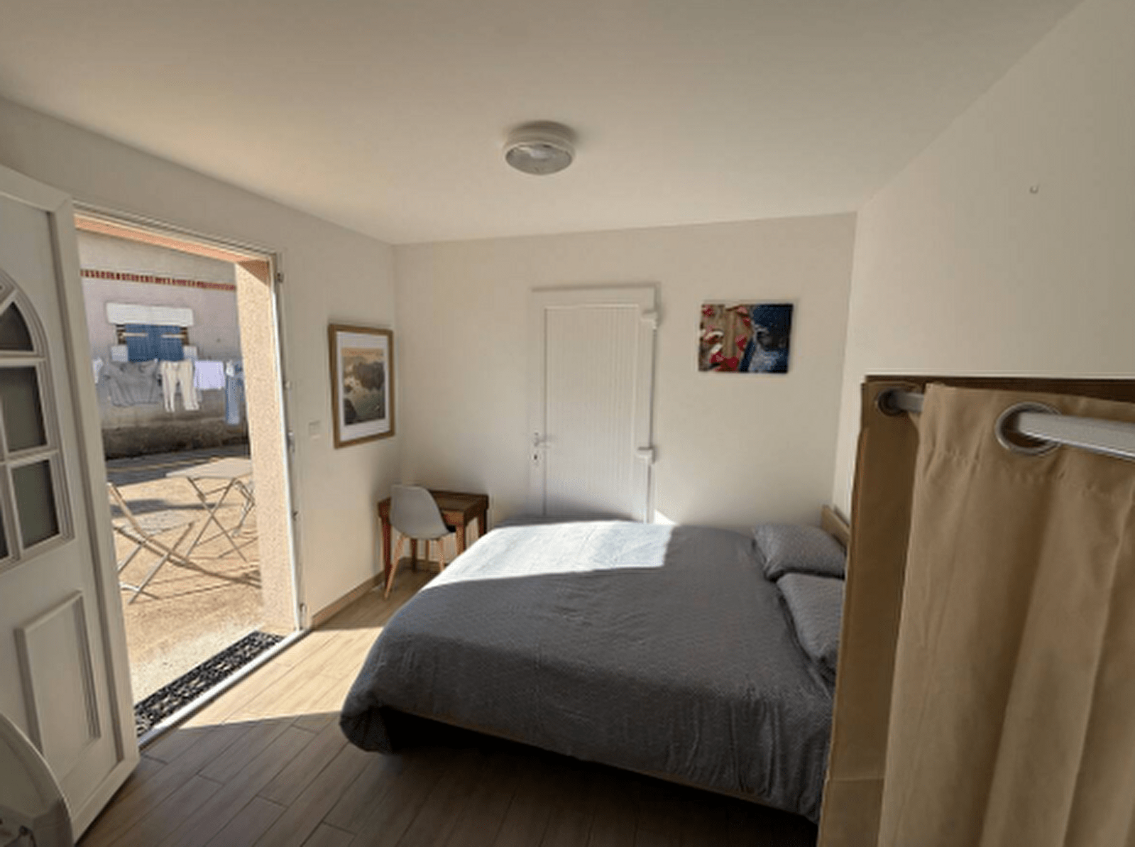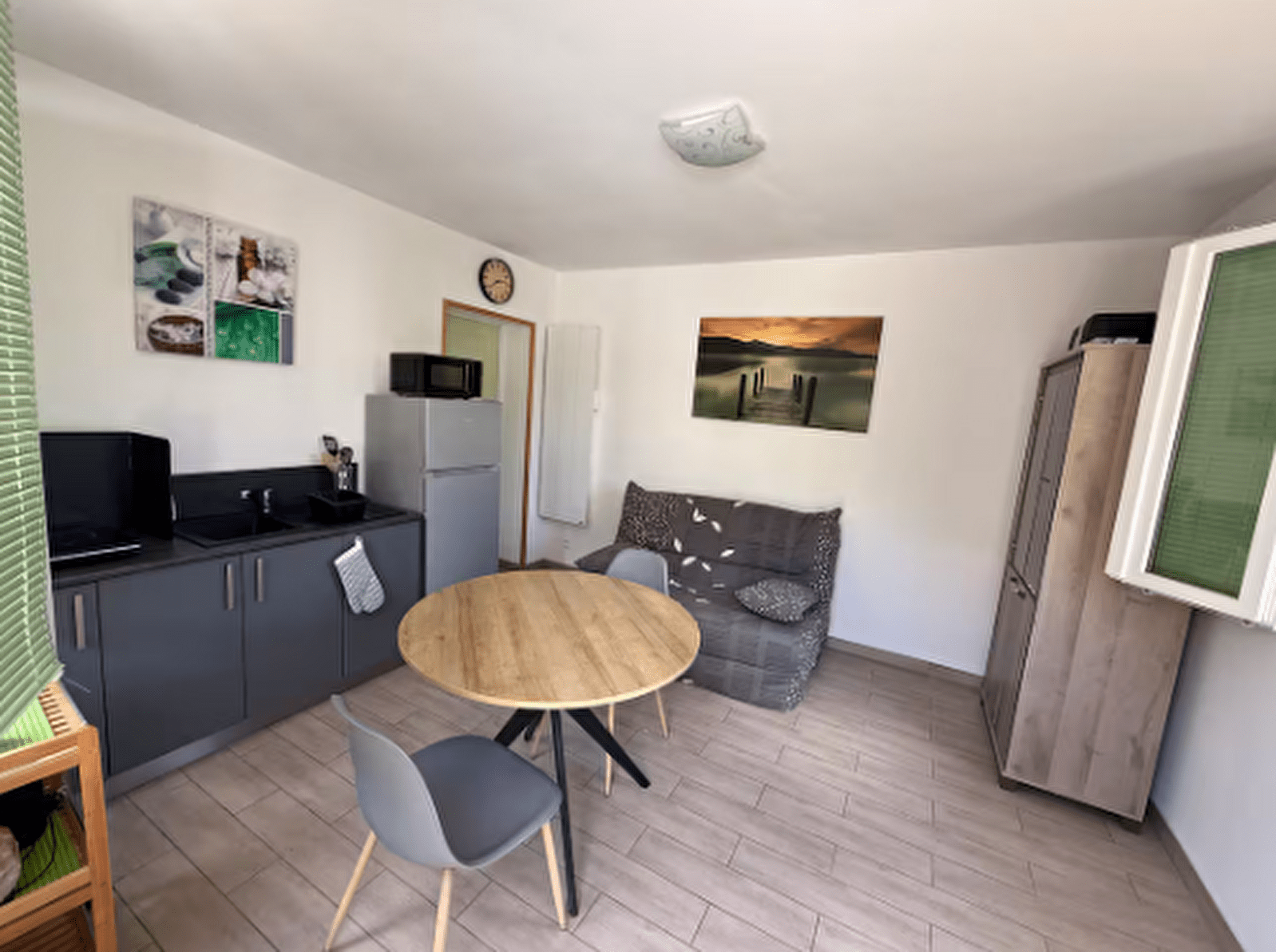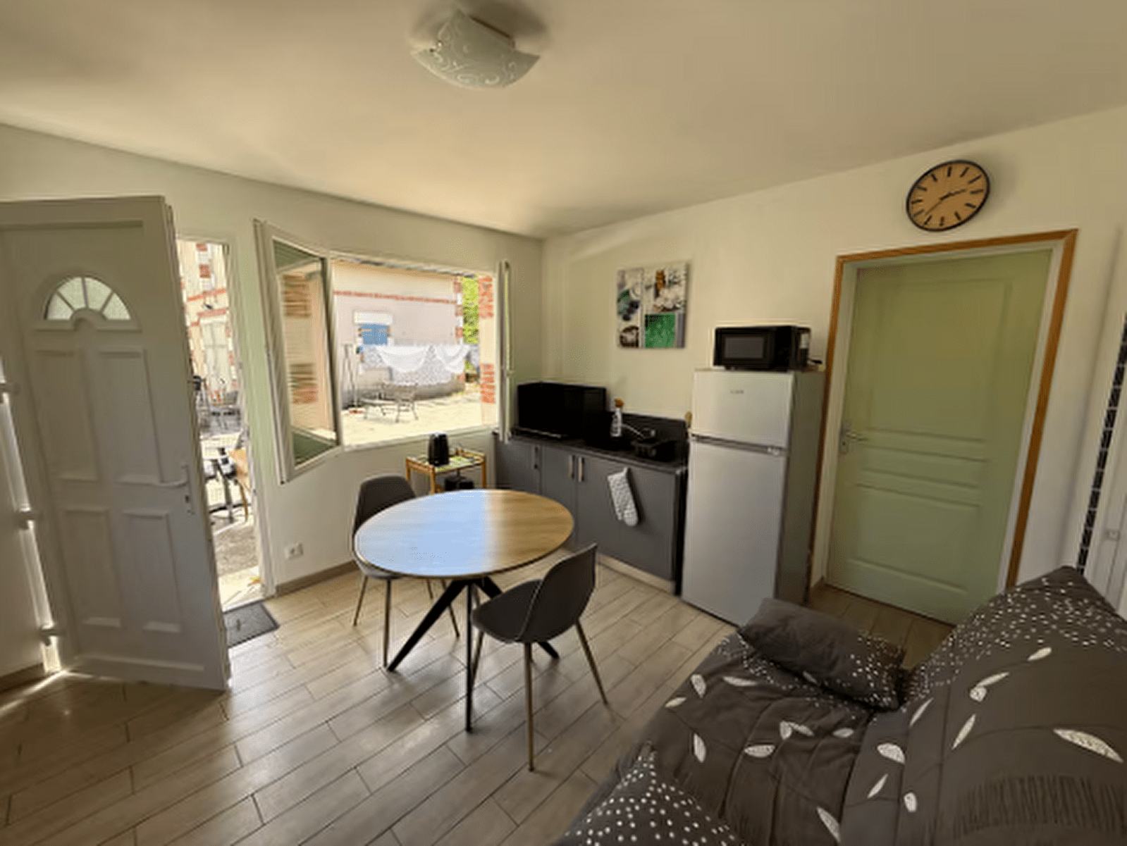 Studio de plain-pied avec une chambre double et un salon-cuisine.