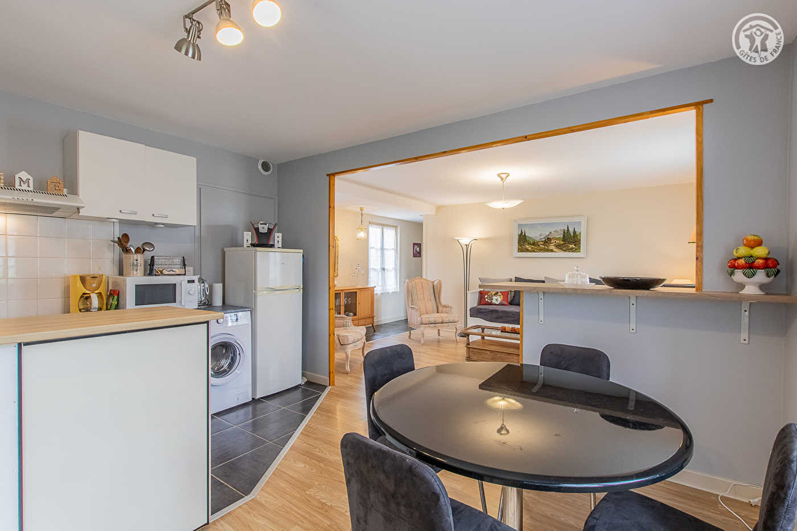 Composition : Maison individuelle voisinant l'habitation des propriétaires (accès par escalier montant depuis la cour). Wifi. Chauffage électrique. Gîte au 1er étage : séjour-cuisine-salon (canapé convertible 2 p. 160x200cm), 1 chambre (lit 2 p. 160x200cm), salle d'eau (douche), Wc indépendant. Balconnet abrité + terrasse privés. Jardin + cour + terrain en commun. Parking privé. Toutes commodités 5 km.