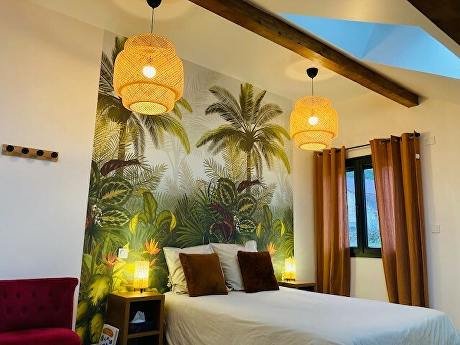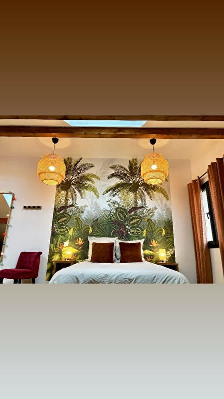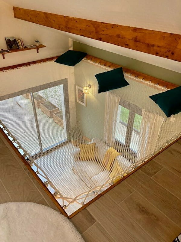 A l’étage vaste espace couchage type loft avec accès filet pour la détente.