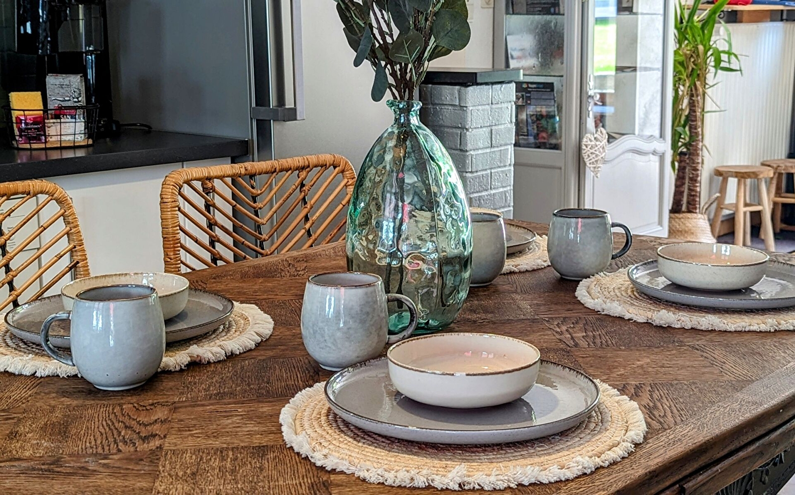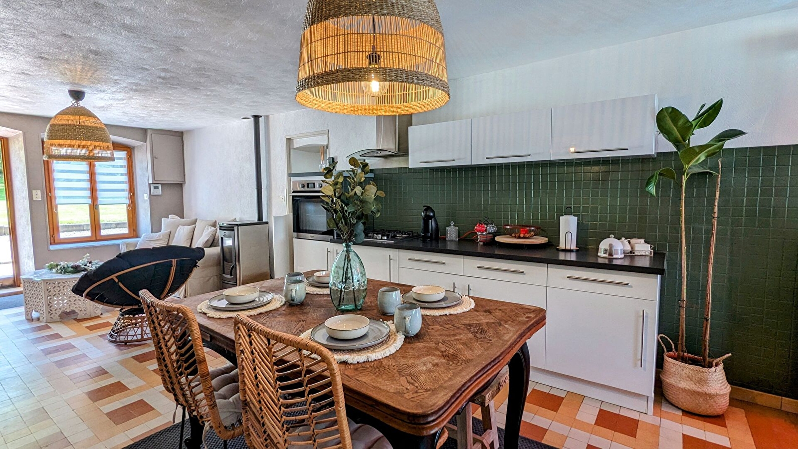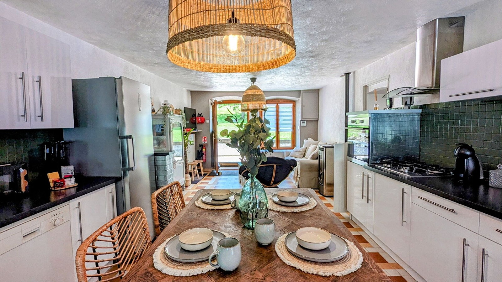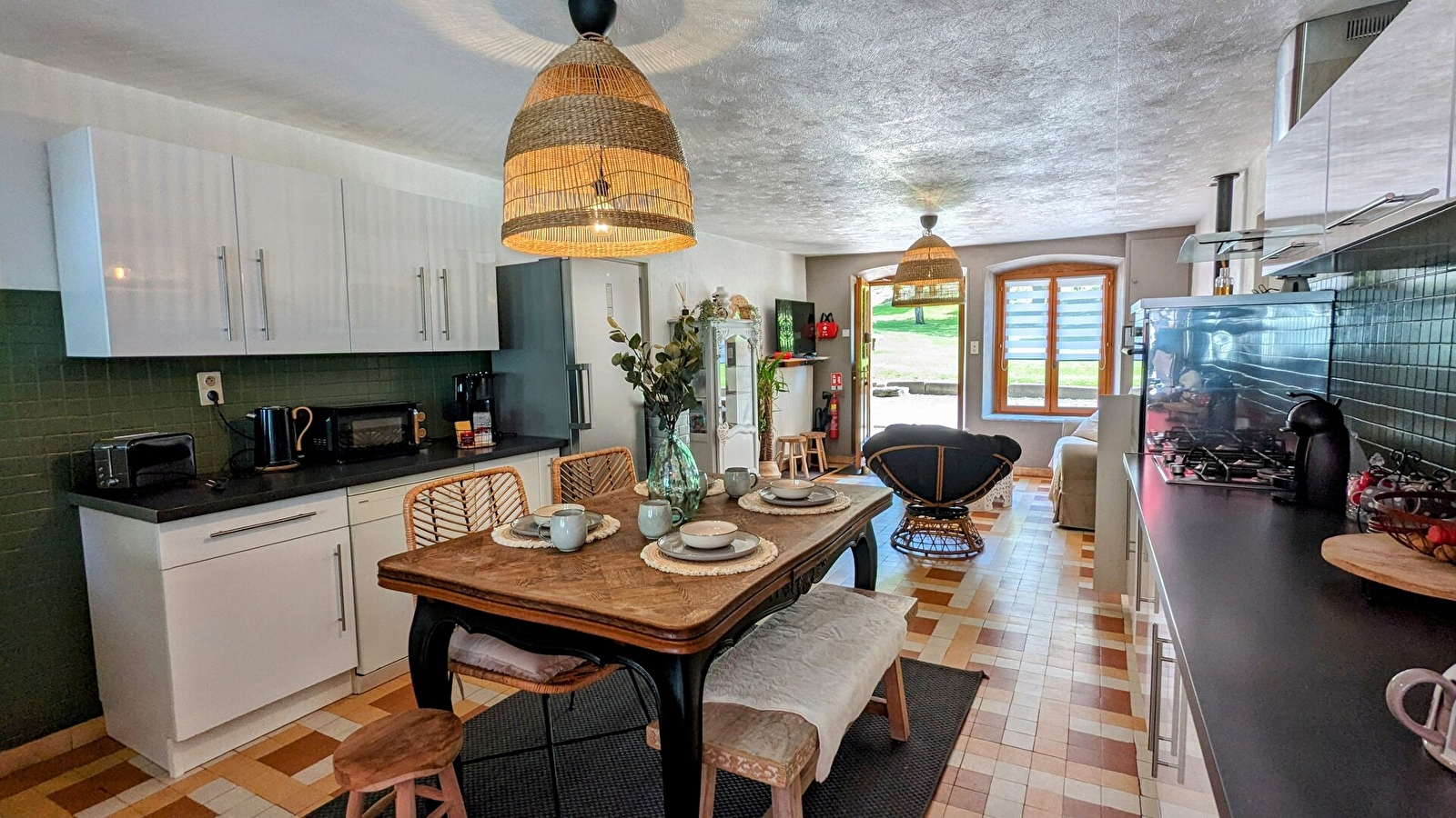 Au rez-de-chaussée : cuisine équipée ouverte sur un petit salon avec TV et WIFI et enceinte connectée avec accès direct à la terrasse, salle à manger, 1 buanderie avec lave-linge et sèche-linge, 1 WC avec douche.