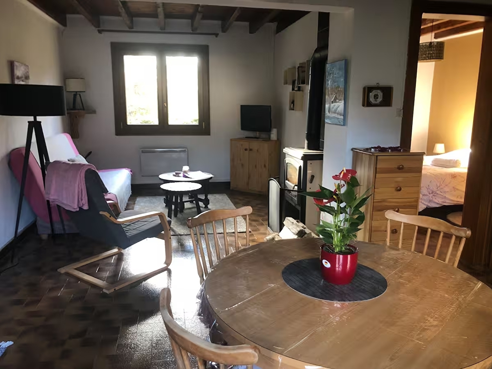 Le salon avec un poêle à bois , un canapé convertible. (Radiateur électrique ).