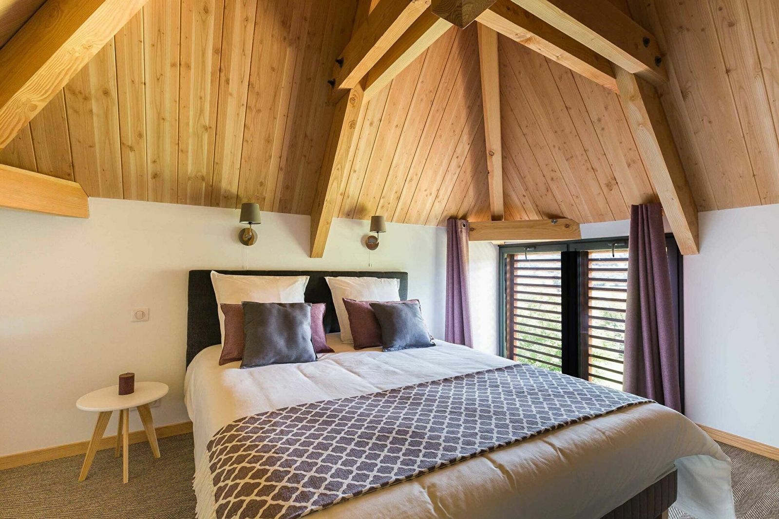Nichée dans le pigeonnier en bois, cette suite aux claustras intimistes accueillera jusqu’à 4 personnes. Elle propose un grand couchage sous la belle charpente apparente, des persiennes en bois, une salle d’eau avec véritable douche italienne et une petite terrasse privative.