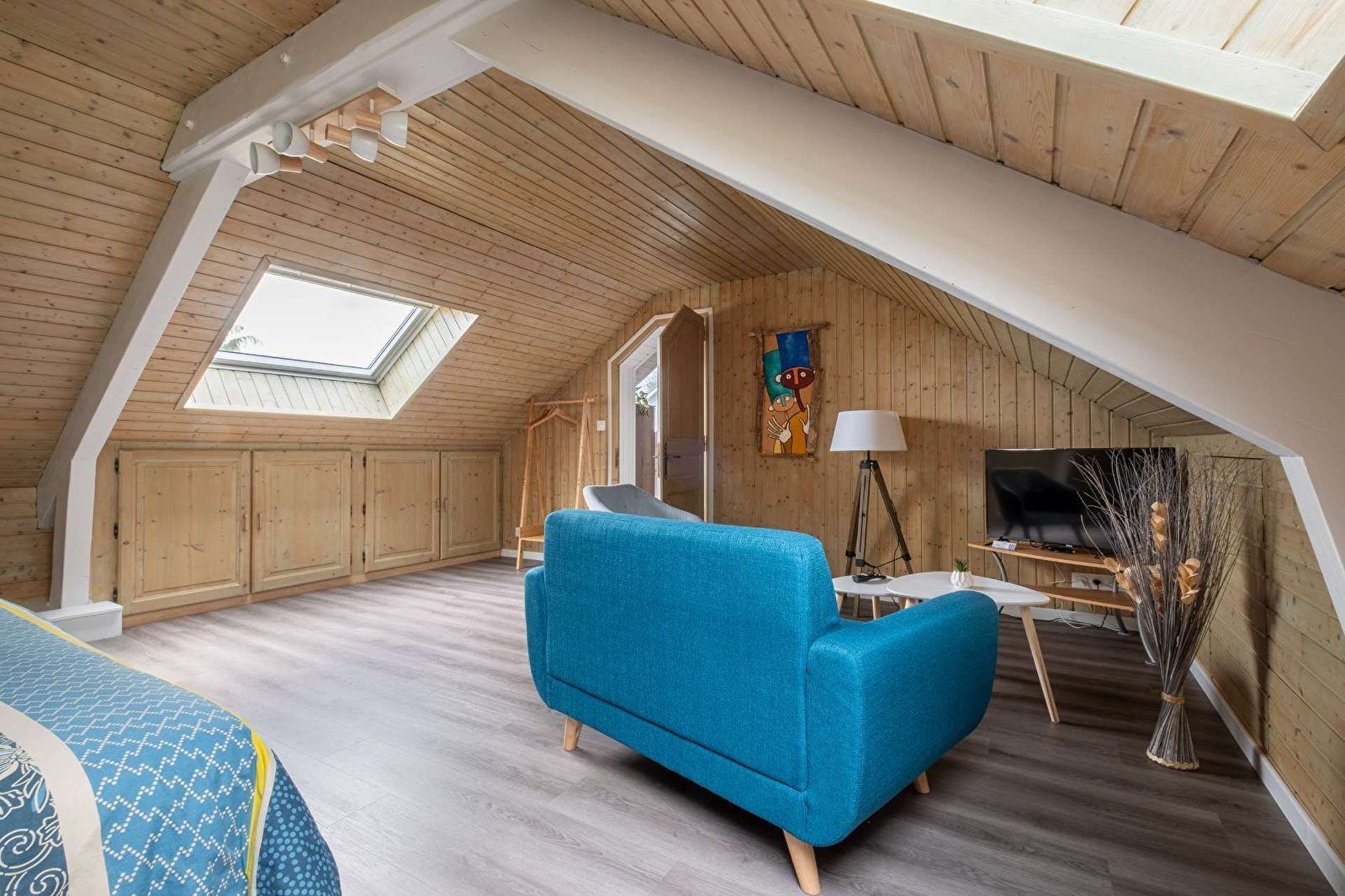 Le salon est équipée d'un coin détente avec TV et canapé et d'un lit queen size (180x200) modifiable en 2 lits simples (90x200), au choix, d'une chambre de 15 m2 (avec lit de 140), d'une cuisine équipée (lave-vaisselle, frigo, plaque induction 4 feux, four, micro-ondes), d'une salle de bain et d'un espace extérieur dédié avec table et chaises.