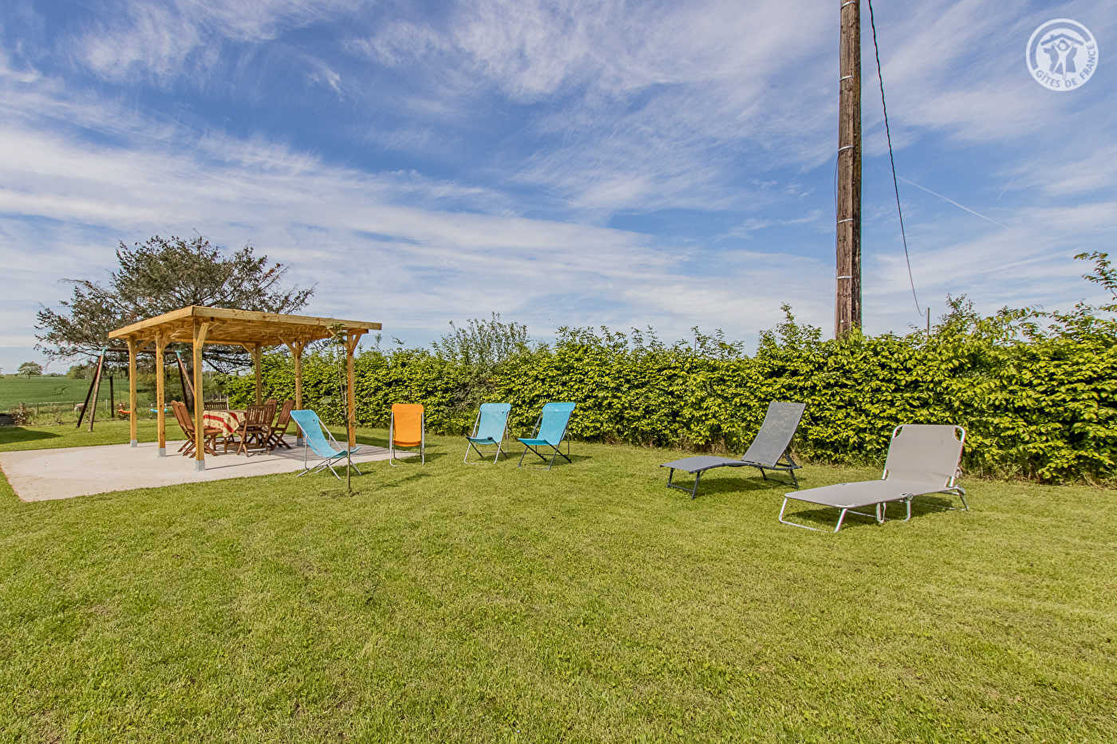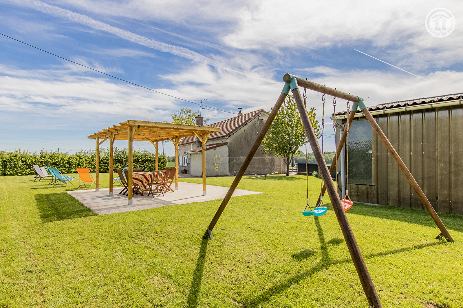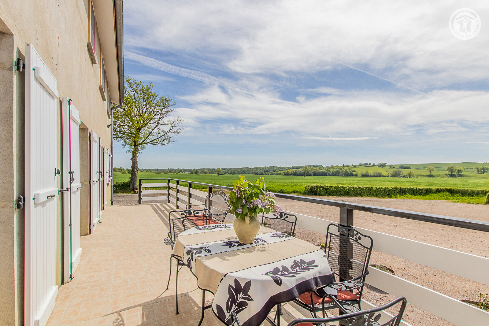 Karine & Rémy vous accueillent au sein d’une maison de pays du début XXème siècle soigneusement restaurée, sise en pleine campagne creusotine, non loin du centre-ville du Creusot & de l’intégralité des services & commodités (dont un supermarché sis à seulement 4 km du gîte), sur une intimiste propriété agricole familiale nichée au bout d’une petite route en impasse (sans activités permanentes particulières, abritant une simple "annexe" de l’exploitation de leur fils située plus loin / écuries & hangar). Ravissant cadre champêtre environnant, blotti au "milieu des prés", au creux d’un vaste bucolique plateau ouvert et vallonné de champs & prairies parsemé de rivières & petites forêts, sans voisins proches sinon les paisibles vaches de race Aubrac parquées sur place en saison. Gîte de très bon confort. Ultra spacieux. Vaste pièce de vie. Chaleureux cachet campagnard aux accents contemporains. Equipement très complet de qualité. Large balcon-terrasse panoramique profitant d’une très belle vue dégagée sur la douce campagne environnante. Agréable jardin engazonné lové en lisière immédiate de pâtures, parfaite "aire de jeux" sécurisée pour les enfants, disposant d’une belle terrasse ombragée sous canisse et de divers jeux d’enfants et équipement de loisir (balançoire, balançoire à bascules "tape-cul", filet de volley & badminton).