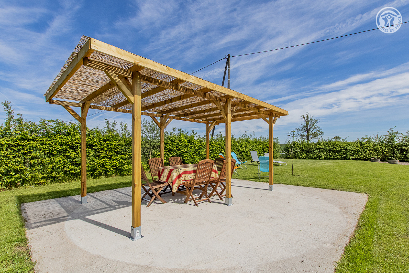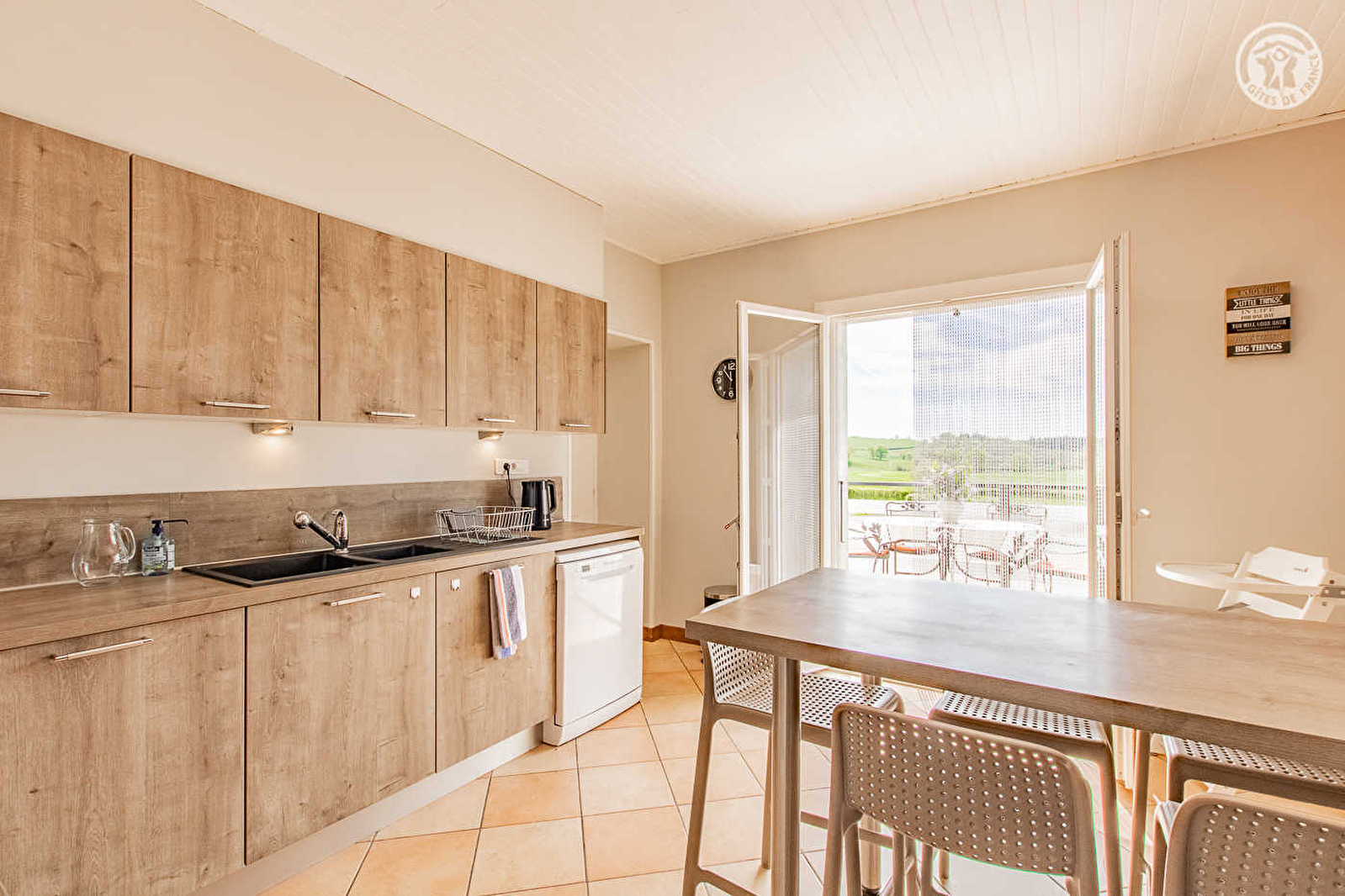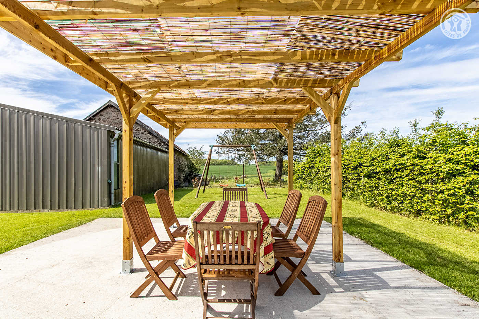 Karine & Rémy vous accueillent au sein d’une maison de pays du début XXème siècle soigneusement restaurée, sise en pleine campagne creusotine, non loin du centre-ville du Creusot & de l’intégralité des services & commodités (dont un supermarché sis à seulement 4 km du gîte), sur une intimiste propriété agricole familiale nichée au bout d’une petite route en impasse (sans activités permanentes particulières, abritant une simple "annexe" de l’exploitation de leur fils située plus loin / écuries & hangar). Ravissant cadre champêtre environnant, blotti au "milieu des prés", au creux d’un vaste bucolique plateau ouvert et vallonné de champs & prairies parsemé de rivières & petites forêts, sans voisins proches sinon les paisibles vaches de race Aubrac parquées sur place en saison. Gîte de très bon confort. Ultra spacieux. Vaste pièce de vie. Chaleureux cachet campagnard aux accents contemporains. Equipement très complet de qualité. Large balcon-terrasse panoramique profitant d’une très belle vue dégagée sur la douce campagne environnante. Agréable jardin engazonné lové en lisière immédiate de pâtures, parfaite "aire de jeux" sécurisée pour les enfants, disposant d’une belle terrasse ombragée sous canisse et de divers jeux d’enfants et équipement de loisir (balançoire, balançoire à bascules "tape-cul", filet de volley & badminton).